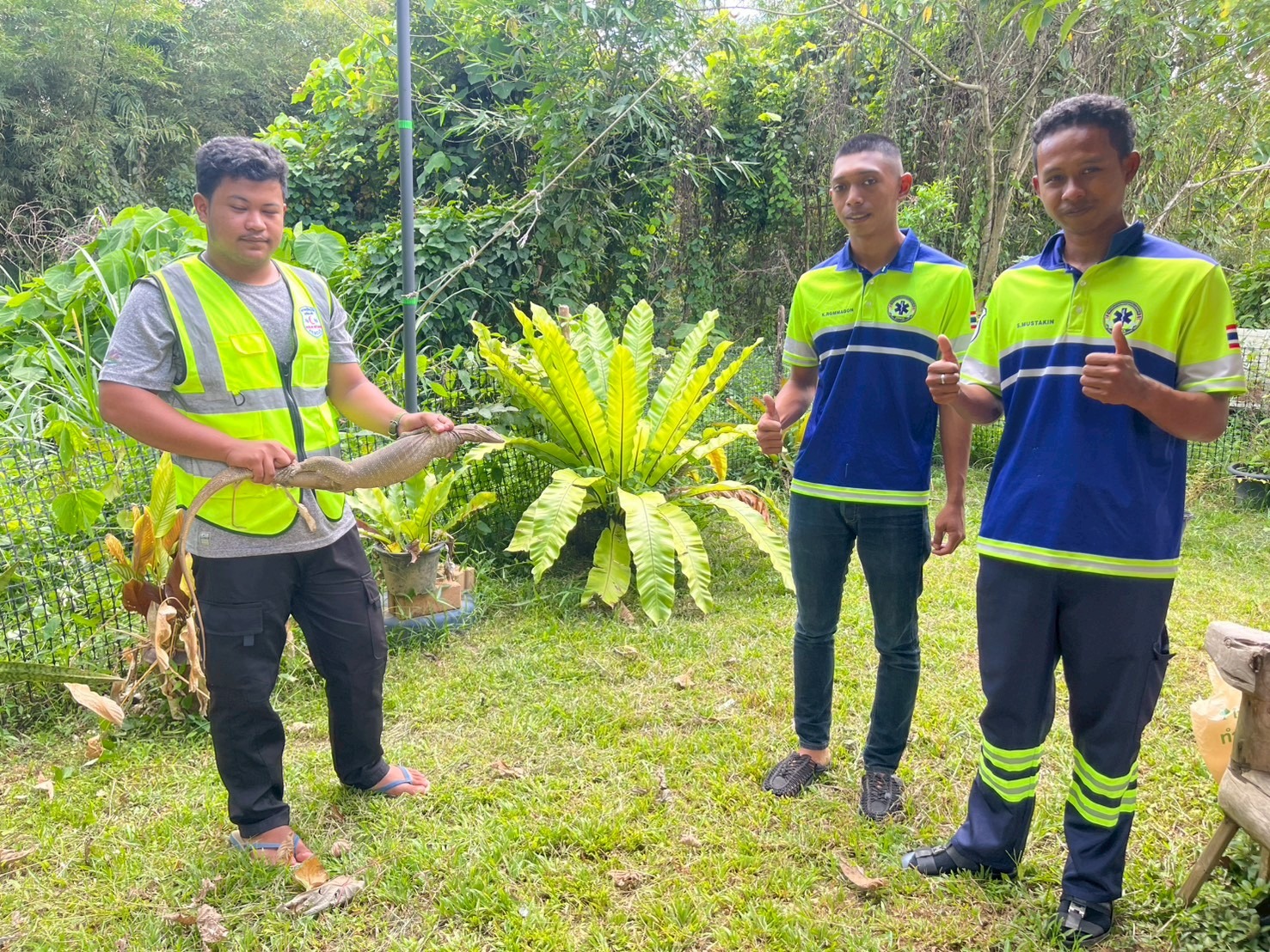 วันที่ 3 ธ.ค. 68 นายโยธิน ประชามติรัฐ หัวหน้าชุดกู้ชีพ-กู้ภัยมุสลิมเบตง รับแจ้งขอความช่วยเหลือจากชาวบ้านในเขตเทศบาลเมืองเบตง อ.เบตง จ.ยะลา ว่าให้จับสัตว์เลื้อยคลานติดรั้วหลังบ้าน สร้างความหวาดกลัวให้กับชาวบ้านอย่างมาก ขอให้ช่วยดำเนินการจับปล่อยคืนสู่ธรรมชาติ เมื่ออาสาสมัครกู้ชีพ-กู้ภัยมุสลิมเบตงไปถึงพบ ตะกวด มีขนาดความยาวเกือบ 2เมตร สีน้ำตาลเข้ม บนตัวมีลายจุดสีเหลืองจางกระจายทั่วไปทั้งลำตัว ส่วนหัวได้ติดรั้วบ้านของชาวบ้านพยายามดิ้นไปมาให้หลุดออกจากรั้วบ้าน ซึ่งทางอาสาสมัครกู้ชีพ-กู้ภัยมุสลิมเบตง ใช้เวลาไม่นานก็สามารถล็อกตัวจับตะกวดด้วยมือเปล่าไว้ได้ ก่อนจะพาไปนั่งท้ายรถ ปล่อยคืนสู่ธรรมชาติต่อไป