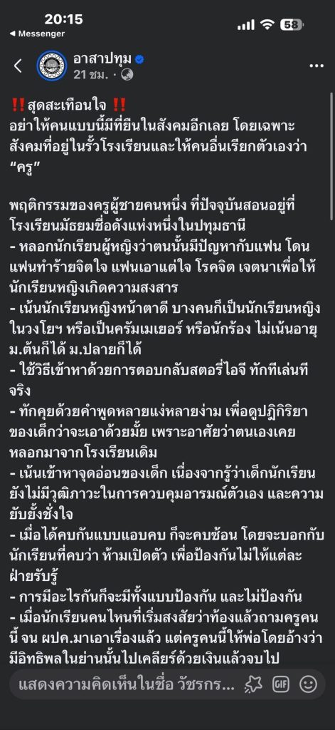 ผู้สื่อข่าวรายงานว่า จากกรณีมีเพจ”อาสาปทุม” ได้โพสต์ลงข้อความว่า “ฉาวต่อครูจังหวัดปทุมธานี หลอก YES เด็กมอต้นโรงเรียนดัง ย่านปทุมธานี แชทขอเด็ก YES เด็ก ม.6 ท้องไปแล้ว”