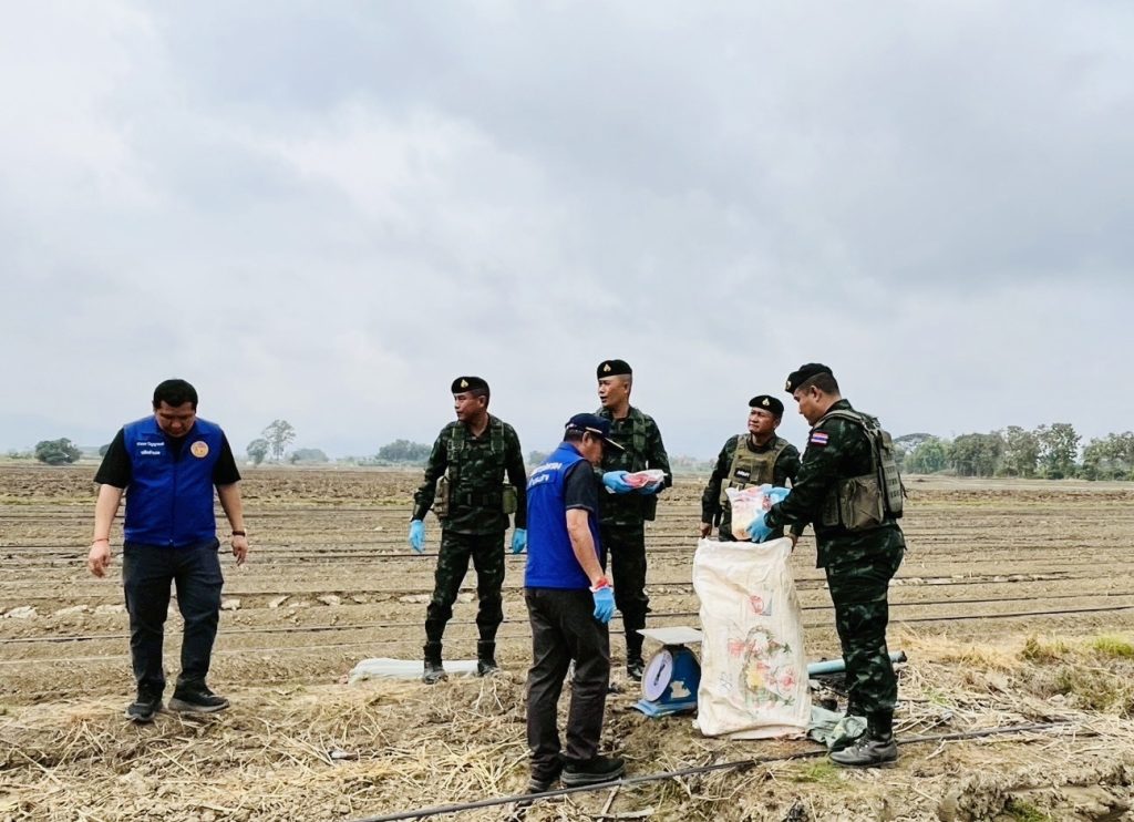 เมื่อเวลา 12.30 น.วันที่ 12 ธันวาคม 2568 พลตรีสาธิต ไวยนนท์ ผู้บัญชาการกองกำลังผาเมือง มอบให้ พันเอกสุพรรณ ร้อยพุทธ ผู้บังคับหน่วยเฉพาะกิจทัพเจ้าตาก พร้อมด้วย เจ้าหน้าที่ที่เกี่ยวข้อง ได้ลงพื้นที่ตรวจสอบเหตุปะทะระหว่างเจ้าหน้าที่และกลุ่มลำเลียงยาเสพติด บริเวณบ้านป่าซางงาม หมู่ 6 ตำบลเกาะช้าง อำเภอแม่สาย จังหวัดเชียงราย ช่วงกลางดึกที่ผ่านมา โดยสามารถตรวจยึดยาเสพติดของกลางเป็นยาไอซ์ประมาณ 250 กิโลกรัม