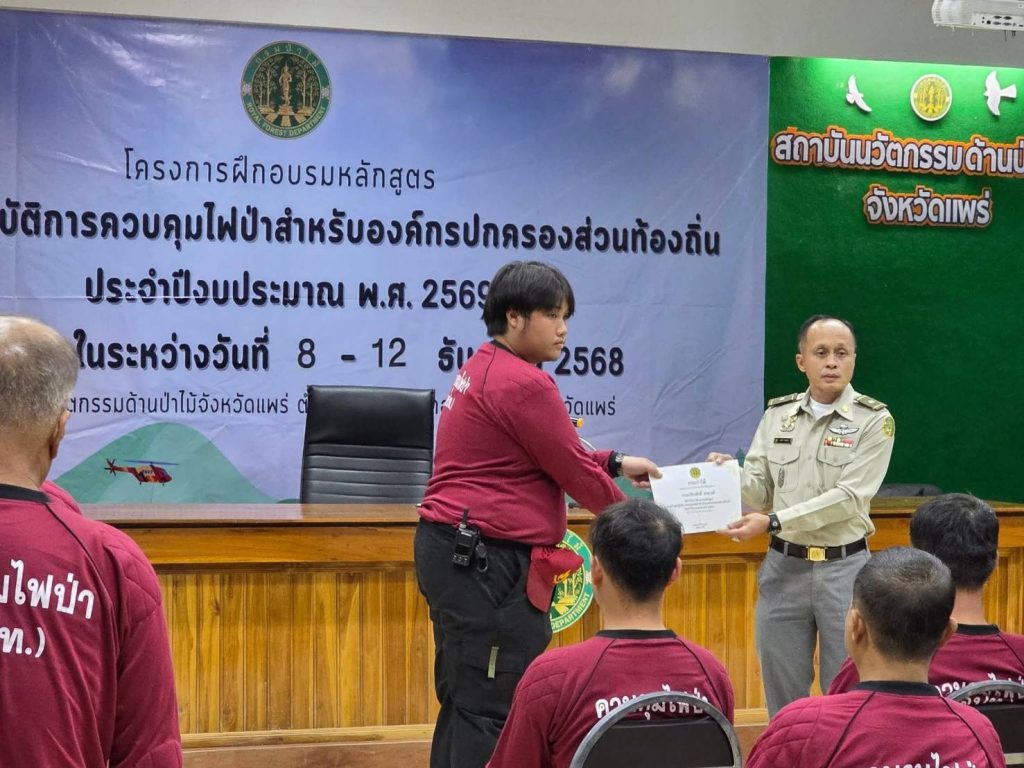 ที่สถาบันนวัตกรรมด้านป่าไม้จังหวัดแพร่ อำเภอเมืองแพร่จังหวัดแพร่ นายธนรัตน์ แปงใจ ผู้อำนวยการสำนักจัดการทรัพยากรป่าไม้ที่ 3 สาขาแพร่ ได้มอบหมายให้ นายเสน่ห์ แสนมูล ผู้อำนวยการส่วนป้องกันรักษาป่าและควบคุมไฟป่าเป็นประธานมอบใบประกาศนียบัตรและกล่าวปิดโครงการฝึกอบรมหลักสูตรหัวหน้าชุดปฏิบัติการควบคุมไฟป่าสำหรับองค์กรปกครองส่วนท้องถิ่น ประจำปีงบประมาณ พ.ศ.2569 โดยมี นายศักดิ์ชาย ดำรงเจริญ ผู้อำนวยการสถาบันนวัตกรรมด้านป่าไม้ จังหวัดแพร่ มาร่วมเป็นเกียรติ ฯ