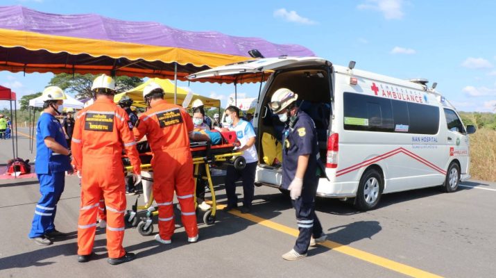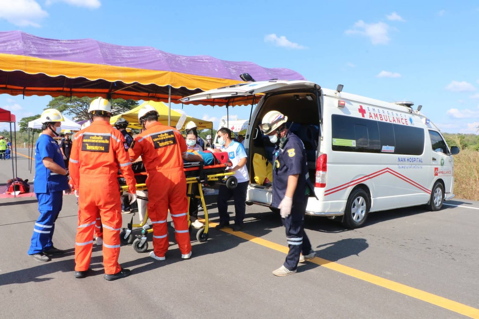 สถานการณ์จำลองเกิดขึ้นเมื่อเวลา 13.00 น. ศูนย์กู้ชีพกู้ภัยจังหวัดน่านได้รับแจ้งจากพลเมืองดีผ่านสายด่วน 1669 ว่าเกิดอุบัติเหตุรถตู้ชนกับรถยนต์กระบะ บริเวณสี่แยกถนนโครงการจัดรูปที่ดินน่าน ส่งผลให้มีผู้ได้รับบาดเจ็บหลายราย หน่วยกู้ชีพกู้ภัยองค์การบริหารส่วนจังหวัดน่านและพื้นที่ใกล้เคียงเข้าพื้นที่ให้การช่วยเหลือ ปฐมพยาบาลเบื้องต้น ก่อนประสานขอการสนับสนุนรถเคลื่อนที่เร็วเพื่อนำส่งผู้บาดเจ็บไปยังโรงพยาบาลน่าน