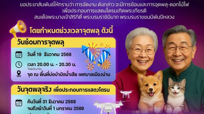 วันศุกร์ที่ 19 ธันวาคม 2568 เวลา 20.00 – 20.30 น. (โดยประมาณ) ณ บริเวณพื้นที่บ่อบำบัดน้ำเสีย เทศบาลเมืองน่าน