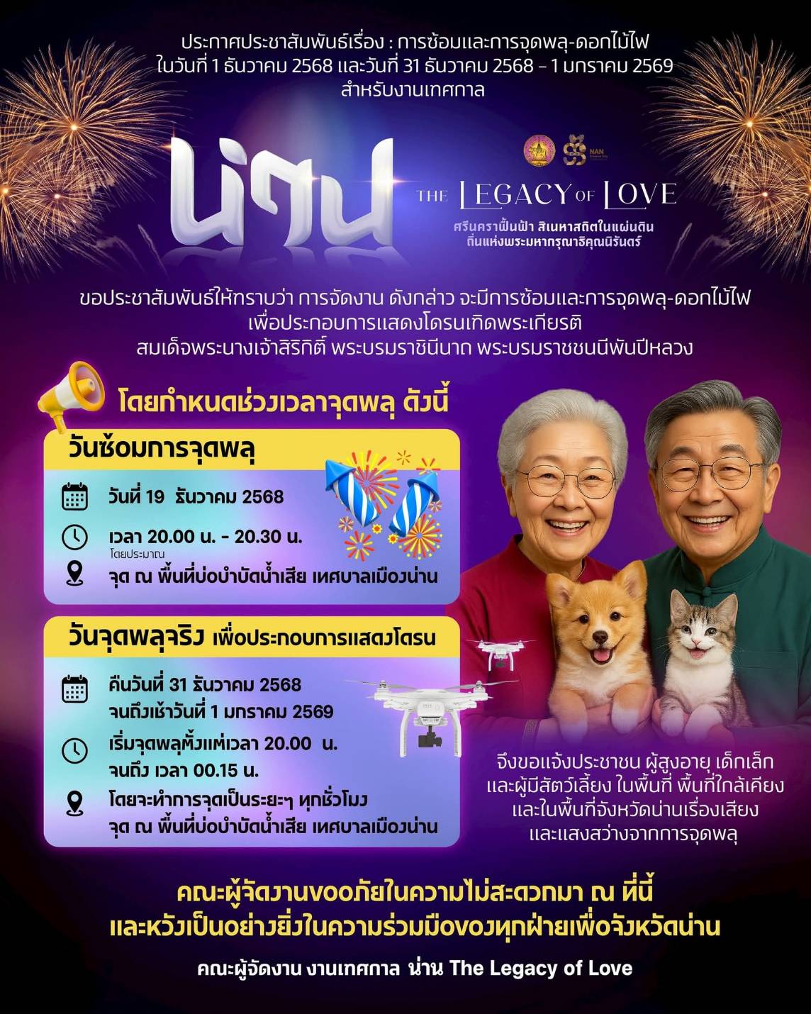 คณะผู้จัดงานเทศกาล “Nan The Legacy of Love” ขอประชาสัมพันธ์ให้ทราบว่า จะมีการซ้อมและการจุดพลุ–ดอกไม้ไฟ เพื่อประกอบการแสดงโดรนเทิดพระเกียรติฯ โดยมีกำหนดการดังต่อไปนี้