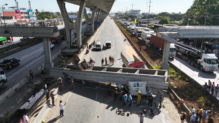 เมื่อเวลา 9.30 น.วันที่ 18 ธ.ค.2568 / ร.ต.ท.อนุพันธ์ คงประพันธ์ รอง สว.(สอบสวน) สภ.บางพลีน้อย อ.บางบ่อ จ.สมุทรปราการ ได้รับแจ้งเหตุคานสะพานลอยคนข้ามถนน หล่นลงมาทับรถบรรทุกพ่วงฯและรถกระบะพังยับเยิน คาดว่ามีคนติดอยู่ภายในและเสียชีวิต เหตุเกิดบริเวณถนนบางนาตราด กม.34 ต.บางพลีน้อย อ.บางบ่อ จ.สมุทรปราการ ขาเข้ากรุงเทพมหานคร หลังรับแจ้งจึงประสานอาสาสมัครมูลนิธิร่วมกตัญญูเดินทางเข้าตรวจสอบและให้ความช่วยเหลือ ที่เกิดเหตุพบคานสะพานลอยคนข้ามถนนขนาดใหญ่ที่อยู่ในช่องทางด่วนด้านใน ทับอยู่บนหัวรถบรรทุกพ่วง 18 ล้อ ยี่ห้อฮีโน่ สีขาว หมายเลขทะเบียน ชลบุรี ที่มีนายลือชัย อายุ 65 ปี ที่หมู่ที่ 3 ต.พรหมบุรี อ.พรหมบุรี จ.สิงห์บุรี เป็นคนขับได้รับบาดเจ็บสาหัส ติดอยู่ภายในหัวรถ ทีมกู้ชีพฯต้องรอรถเครนมายกคานออก ก่อนจะใช้เครื่องตัดถ่างช่วยนำตัวผู้บาดเจ็บที่มีอาการสาหัสออกมานำส่งโรงพยาบาล โดยมี น.ส.วิภา ลูกสาวของผู้บาดเจ็บ เดินทางมาที่เกิดเหตุร่ำไห้ด้วยความเป็นห่วงพ่อ ทีมกู้ชีพฯต้องช่วยกันปลอบใจ ถัดไปในช่องทางด้านขวา พบรถยนต์กระบะยี่ห้อโตโยต้า สีบรอนซ์ หมายเลขทะเบียน กรุงเทพมหานคร สภาพถูกคานสะพานลอยทับที่ส่วนหัวของรถพังยับเยิน ภายในพบร่างผู้เสียชีวิตเป็นชายหนึ่งราย ทราบชื่อ นายสังเวียน อายุ 59 ปี ที่ ต.มหาชัย อ.เมืองสมุทรสาคร จ.สมุทรสาคร สภาพหัวเละชิ้นส่วนอวัยวะกระจายเกลือน สวมเสื้อยืดแขนสั้นสีดำ สวมกางเกงขาสามส่วนสีเทา ทีมกู้ชีพช่วยเหลือนำร่างออกมานำส่งชันสูตรที่สถาบันนิติเวช รพ.รามาธิบดีจักรีนฤบดินทร์