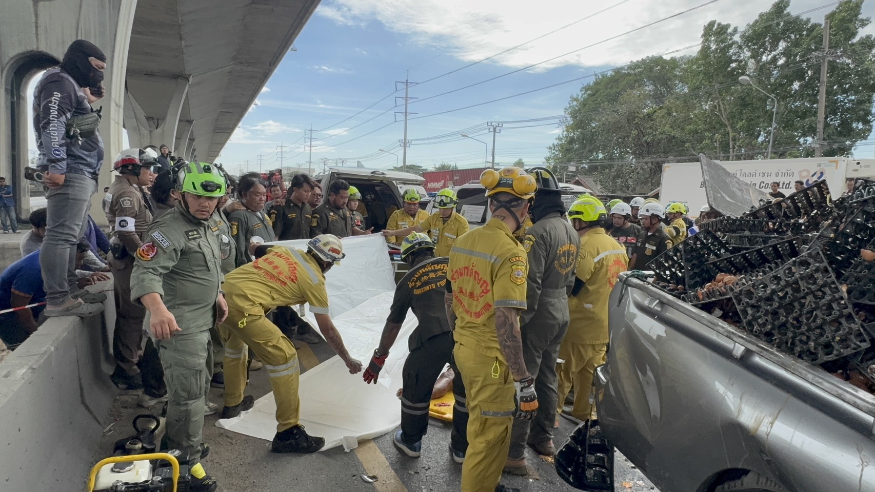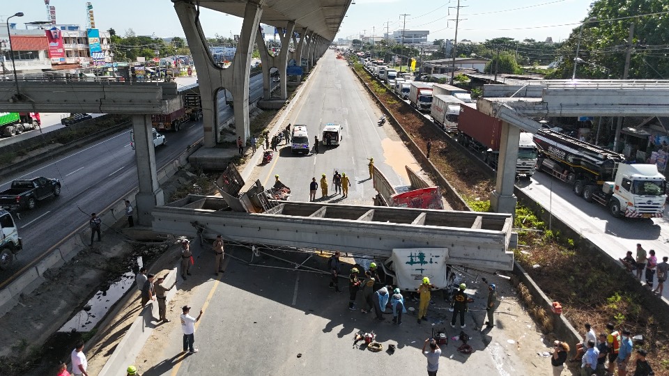 ระทึก คานสะพานลอยหล่นทับรถพ่วงยับติดภายใน ส่วนกระบะขายไข่ดับอนาถ