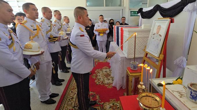 เมื่อถึงเวลา 13.45 น. พ.อ.(พ) ณัฐพล จวนเจริญ เสนาธิการกองพลทหารราบที่ 2 รักษาพระองค์ ประธานในพิธี เดินทางไปเป็นประธานในพิธี ทอดผ้าบังสุกุล โดยมีผู้บังคับบัญชาพร้อมกำลังพล มารดาและญาติ พร้อมด้วยเจ้าหน้าที่โรงพยาบาลเจ้าพระยาอภัยภูเบศร และประชาชน เข้าแถวพร้อมโบกสะบัดธงชาติไทยเพื่อส่งทหารกล้าที่หน้าโรงพยาบาลอย่างสมเกียรติ