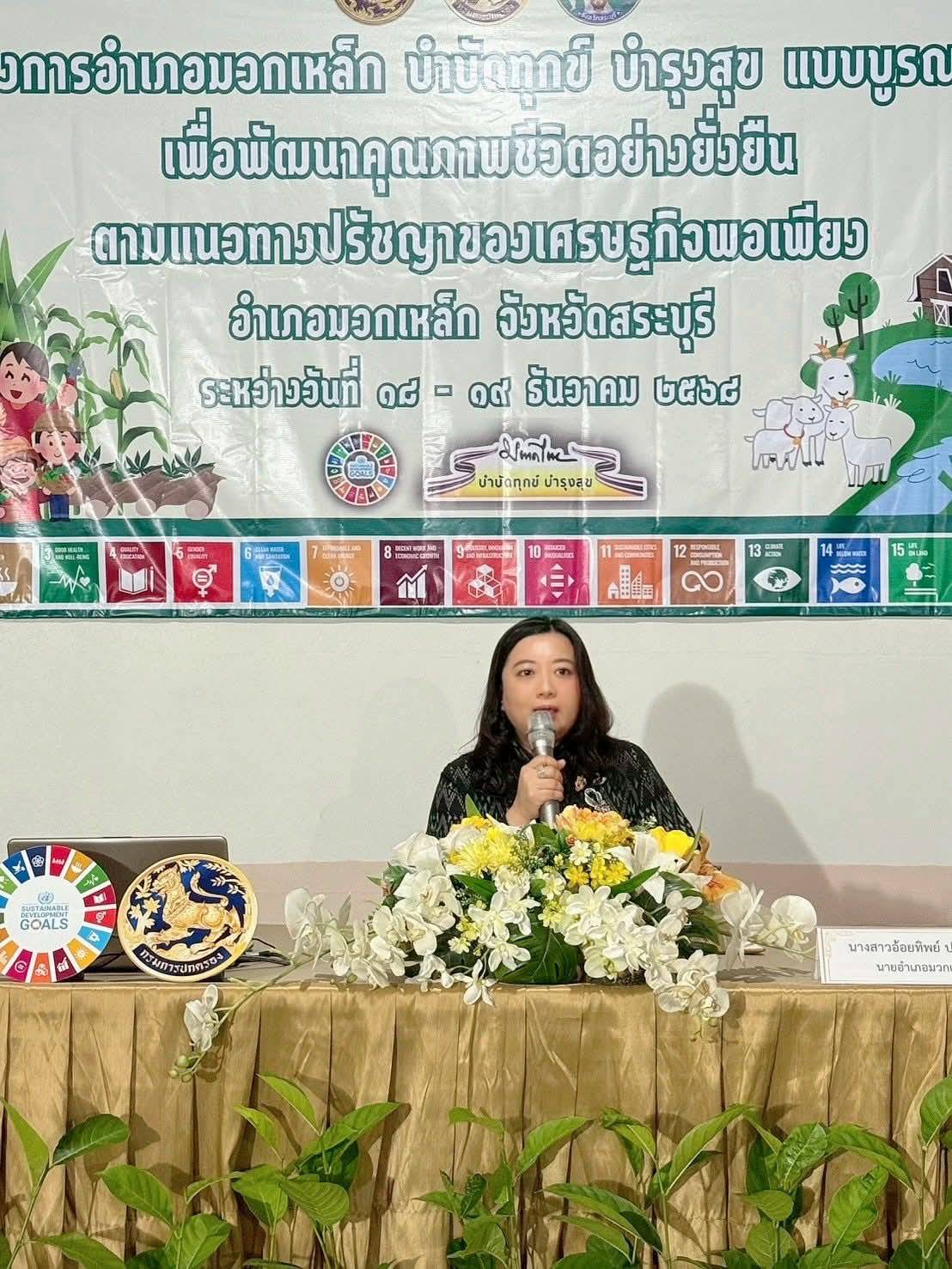 ส่วนที่ สระบุรี ด้าน นางสาวอ้อยทิพย์ ปานสอาด นายอำเภอมวกเหล็ก เป็นประธานในพิธีเปิดโครงการอำเภอมวกเหล็ก บำบัดทุกข์ บำรุงสุข แบบบูรณาการเพื่อพัฒนาคุณภาพชีวิตอย่างยั่งยืน ตามแนวทางปรัชญาของเศรษฐกิจพอเพียง อำเภอมวกเหล็ก จังหวัดสระบุรี ณ บ้านไร่สมเกียรติโฮมสเตย์ ตำบลหนองย่างเสือ อำเภอมวกเหล็ก จังหวัดสระบุรี พร้อมด้วยปลัดอำเภอหัวหน้ากลุ่มงานทะเบียนและบัตร ปลัดอำเภอ โดยมีวัตถุประสงค์เพื่อให้เกษตรกรและประชาชนในอำเภอมวกเหล็ก ปรับเปลี่ยนทัศนคติให้สามารถดำเนินชีวิตและประกอบอาชีพตามหลักปรัชญาของเศรษฐกิจพอเพียง และการทำเกษตรอินทรีย์ โดยสร้างความรู้ความเข้าใจที่ถูกต้องท่ามกลางกระแสการเปลี่ยนแปลงของโลกที่รวดเร็ว เพื่อให้เกิดการพัฒนาตนเอง มีภูมิคุ้มกัน และมีคุณภาพชีวิตดีอย่างยั่งยืน ผู้เข้าร่วมโครงการประกอบด้วย กำนัน ผู้ใหญ่บ้าน ฯลฯ เกษตรกรและประชาชนในพื้นที่ตำบลมิตรภาพ ตำบลมวกเหล็ก และตำบลหนองย่างเสือ รวมจำนวน 60 คน