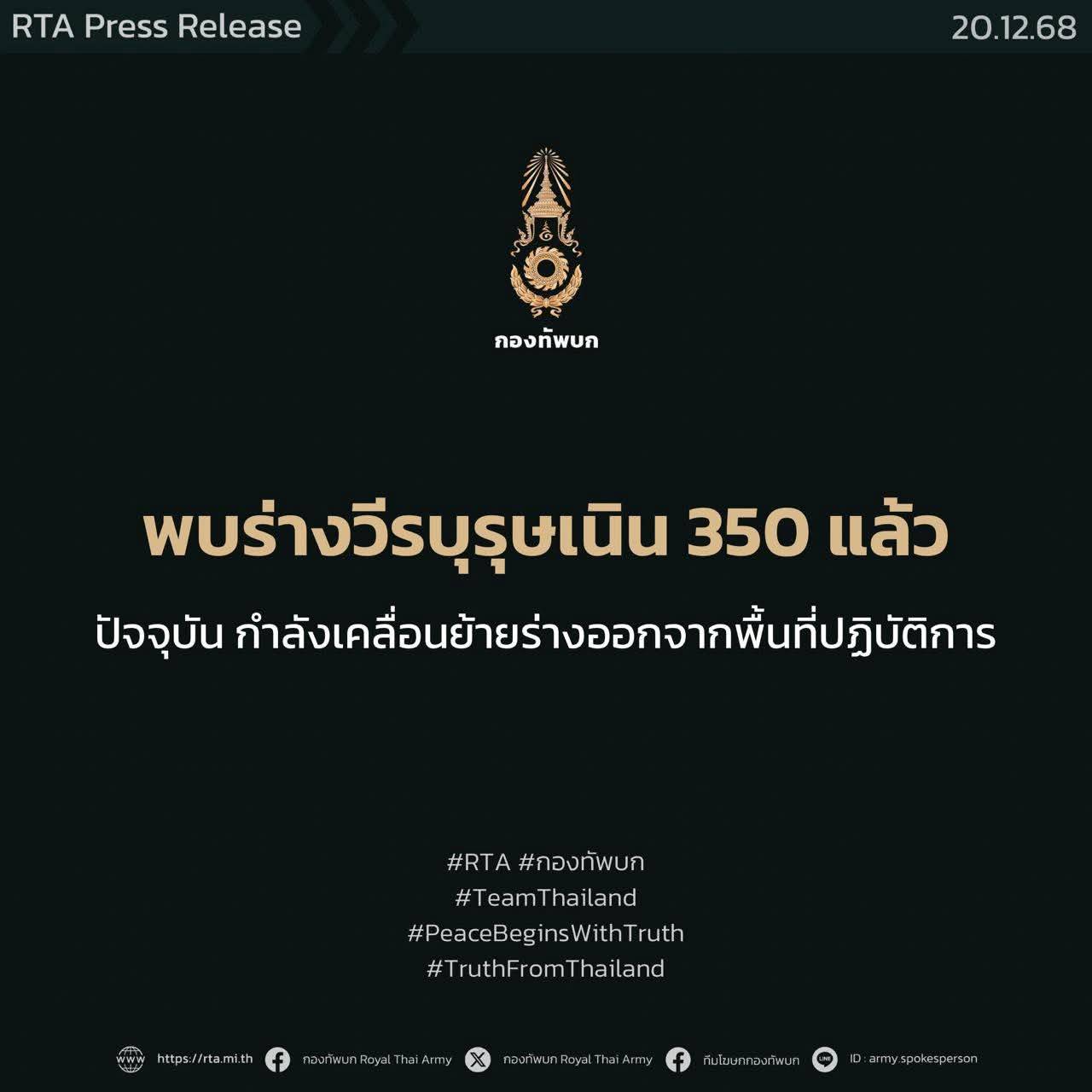 วันนี้ (20 ธันวาคม 2568) ณ กองบัญชาการกองทัพบก พลตรี วิธัย สุวารี โฆษกกองทัพบก เปิดเผยว่า ปัจจุบันกองทัพบกได้รับรายงานล่าสุดจากกองทัพภาคที่ 2 เกี่ยวกับสถานการณ์การสู้รบในพื้นที่ชายแดน บริเวณปราสาทตาควาย และพื้นที่เนิน 350 โดยกองทัพภาคที่ 2 รายงานว่า ได้พบร่างกำลังพลทหารที่เสียชีวิต 2 นาย (จ่าสิบเอกสำเริง คลังประโคน และ พลทหารภานุพัฒน์ เสาร์สา)ในพื้นที่ปฏิบัติการ โดยขณะนี้อยู่ระหว่างการเคลื่อนย้ายร่างวีรบุรุษทั้งสองนายกลับมายังพื้นนที่ส่วนหลัง