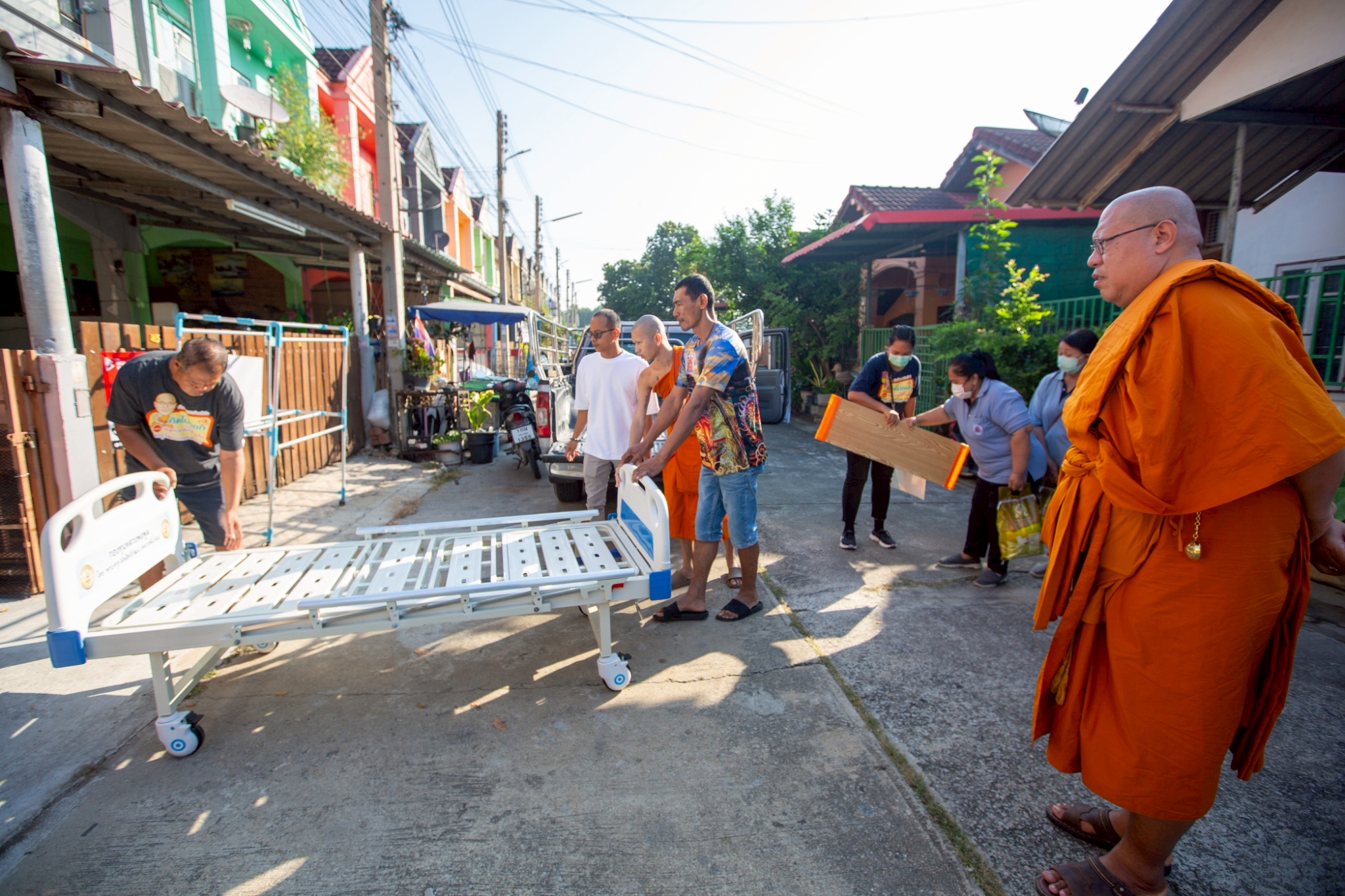 ล่าสุดหลวงพี่น้ำฝน ผู้รักษาการแทนเจ้าอาวาสฯ พร้อมด้วยเจ้าหน้าที่ได้เดินทางลงพื้นที่ไปยังบ้านเลขที่ 28/44 หมู่ที่ 6 ต.บ่อพลับ อ.เมือง จ.นครปฐม เพื่อนำเตียงสำหรับผู้ป่วย ข้าวสารอาหารแห้ง และเครื่องยังชีพที่จำเป็น ไปมอบให้กับครอบครัว ของนายเดช อายุ 58 ปี ซึ่งมีอาการป่วยหนักต้องนอนพักรักษาตัวอยู่บนเตียง โดยมีนางอรอนงค์ อายุ 50 ปี ภรรยาเป็นผู้คอยดูแล และมีคณะ อมส. ประจำตำบลบ่อพลับ คอยให้การช่วยเหลือ นอกจากนี้ยังได้ให้ปัจจัยรวมถึงบรรยายธรรมแบบกระชับเข้าใจง่าย เพื่อเป็นกำลังใจให้กับผู้ป่วย และครอบครัว รวมถึงแสดงความขอบคุณ คณะ อสม. ตำบลบ่อพลับ ที่ร่วมมือร่วมใจกันในการดูแลครอบครัวที่ประสบปัญหาทางด้านสุขภาพ