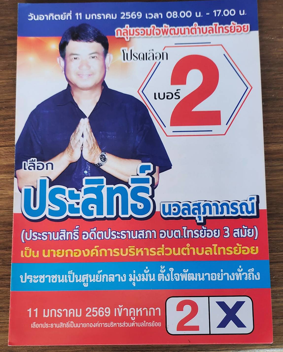 “17 ปีที่รอคอยของผม และปีนี่ ปีที่ 18 ผมจะได้แสดงฝีไม่ลายมืออย่างเต็มที่ ผมขอโอกาสจากพี่น้องทั้งตำบล เลือกผม “ประสิทธิ์ นวลสุภาภรณ์”ผู้สมัคร นายก อบต.ไทรย้อย เบอร์ 2 เข้ามาเป็นผู้บริหารฯ แก้ไขปัญหาของพี่น้องประชาชนที่มีมานาน ผมจะ เข้ามาปัดเป่า ปัญหาของพี่น้องประชาชนตำบลไทรย้อยให้หมดไป