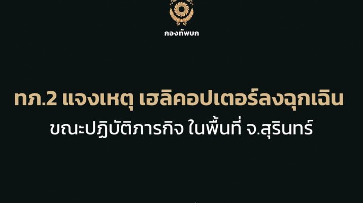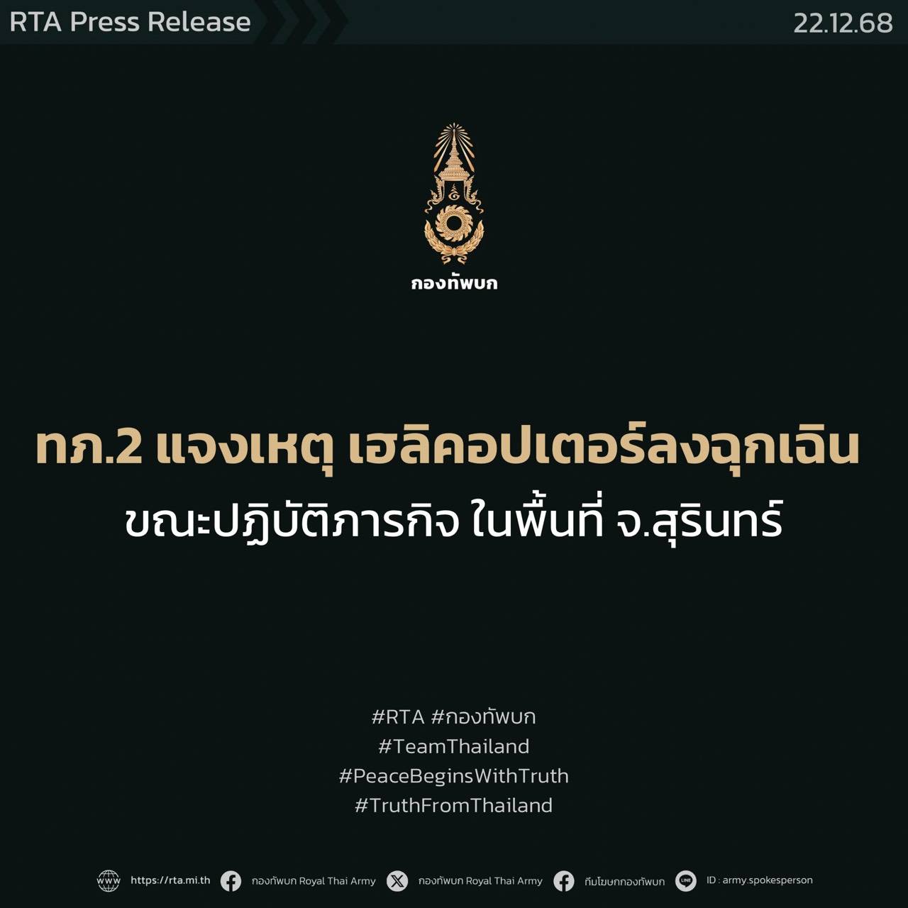 วันนี้ 22 ธันวาคม 2568 เวลา 17.19 นาฬิกา กองทัพบกได้รับรายงานจากกองทัพภาคที่ 2 กรณีเกิดเหตุอากาศยานเฮลิคอปเตอร์ ฮท.212 ของกองทัพบก เสียการควบคุมจนต้องทำการลงฉุกเฉิน ณ สนามบินสุรินทร์ภักดี จ.สุรินทร์ ทำให้มีผู้ได้รับบาดเจ็บเล็กน้อย 3 นาย ได้แก่ พ.ต.สุชาติ นาคเจริญ (นักบิน) , จ.ส.อ.กิตติพงษ์ ฉิมไทย (ช่างเครื่อง) และ จ.ส.ต.เอกรินทร์ จิตริต (ช่างเครื่อง) ปัจจุบันได้นำผู้ป่วยเจ็บเข้ารับการรักษา ณ โรงพยาบาลค่ายวีรวัฒน์โยธินเรียบร้อยแล้ว สำหรับรายละเอียดของการเกิดเหตุนั้น จะได้มีการตรวจสอบต่อไป