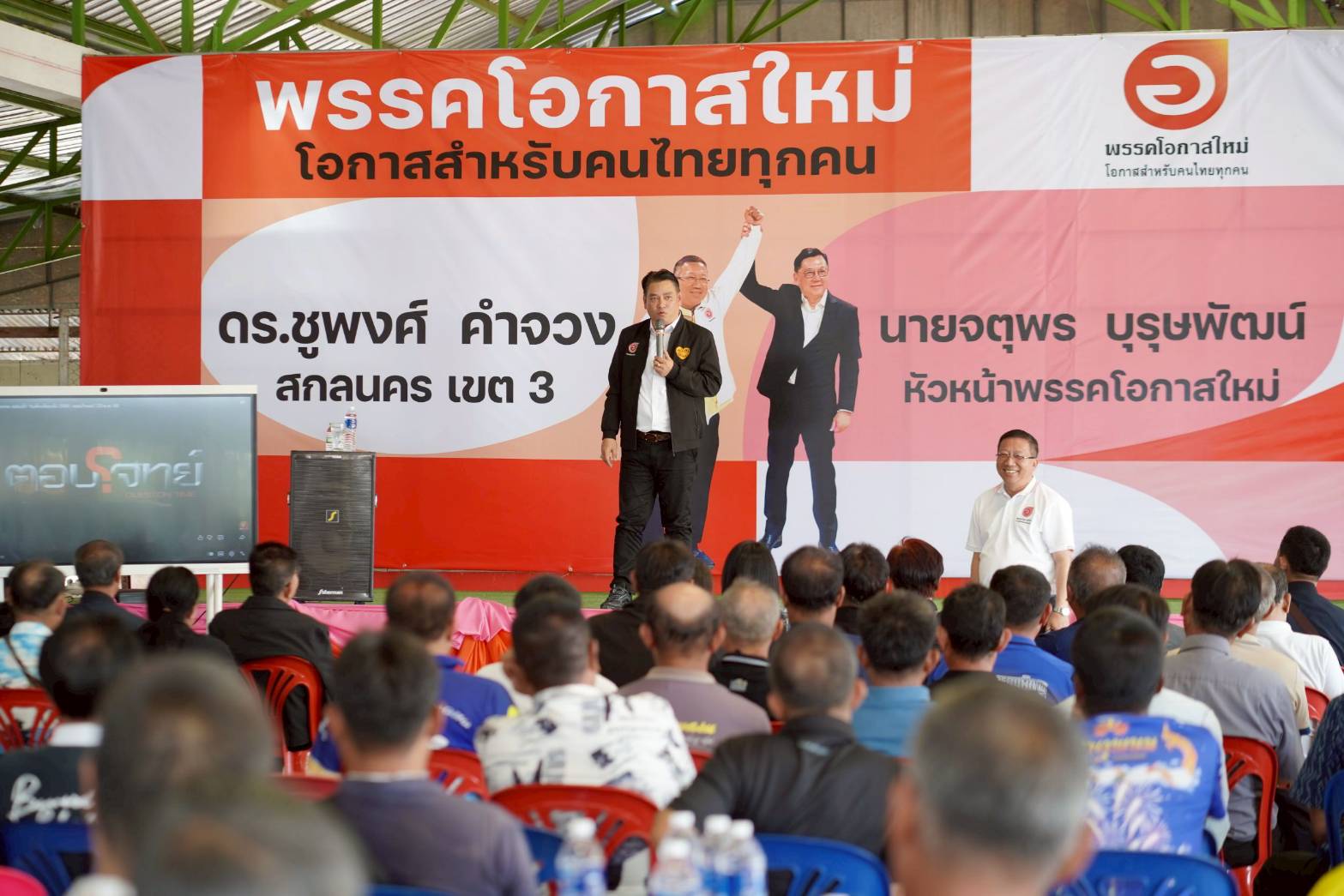ด้านนายประภาส ยงคะวิสัย หรือแอสป้า แกนนำคนสำคัญของพรรคโอกาสใหม่ แม่ทัพอีสานพรรคโอกาสใหม่ กล่าวว่าพรรคโอกาสใหม่ มีนายจตุพร บุรุษพัฒน์ เป็นหัวหน้าพรรคอดีตปลัดกระทรง ทส. และ อดีต รมว.พาณิชย์ เป็นคนมีความรู้ความสามารถ ซึ่งได้ให้ตนมาคุมทัพภาคอีสาน ตั้งเป้า ส.ส.5 ที่นั่ง รวมถึงเขต 3 สกลนคร คือ ดร.ชูพงศ์ คำจวง โดยแนวทางการสู้ศึกเลือก รวมถึงนโยบายดีๆของพรรคที่เป็นประโยชน์ แก้ปัญหาปากท้อง สร้างรายได้ให้กับประชาชนด้วย โดยเฉพาะสโลแกน มีเราไม่มีมืดที่คิดขึ้นมา เนื่องจากตนเห็นป้าคนหนึ่งเขียนป้ายติดตรงมิเตอร์ไฟฟ้าว่าอย่าเพิ่งตัดไฟจะไปจ่ายอยู่ 250 บาท แต่พอกลับมาไม่เห็นมิเตอร์ไฟแสดงว่าถูกตัดแล้ว จึงมีนโยบายใช้ไฟฟรี 300 บาท นอกจากนี้ยังส่งเสริมติดโซล่าร์รูฟครอบครัวยากจนให้ใช้ไฟฟรีตลอดชีวิต