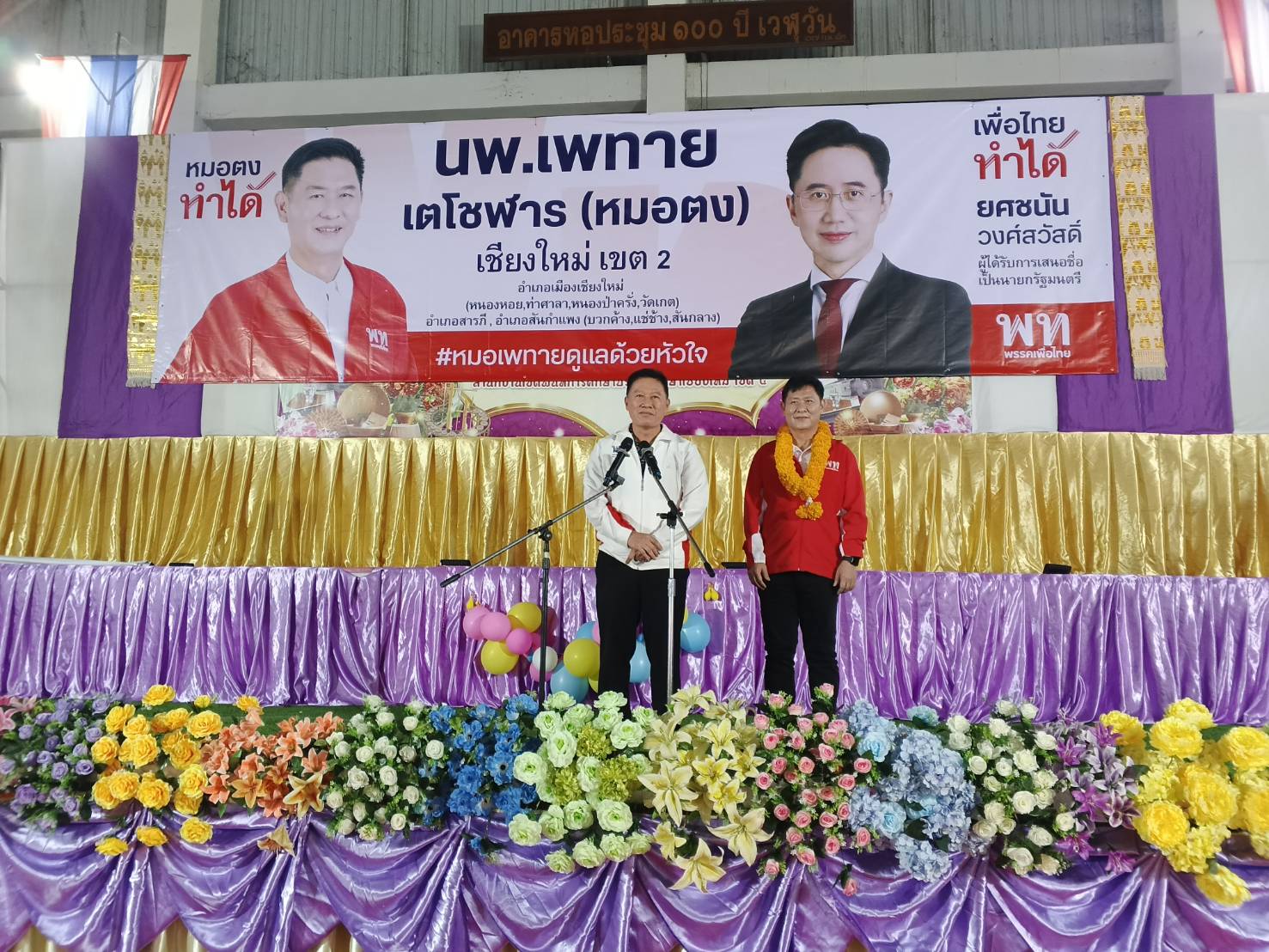 ผึ้ง อ.สารภี จ.เชียงใหม่ นายพิชัย เลิศพงศ์อดิศร หรือ ส.ว.ก๊อง นายก อบจ.เชียงใหม่ ในฐานะผู้ช่วยหาเสียงพรรคเพื่อไทย ได้เปิดเวทีปราศัยหาเสียงสนับสนุน นพ.เพทาย เตโชฬาร หรือหมอตง อดีตรองนายก อบจ. เชียงใหม่ ว่าที่ผู้สมัครส.ส. เชียงใหม่ เขต 2 พรรคเพื่อไทย ครั้งแรก มีนายพิพัฒน์ชัย ไพบูลย์ อดีตเลขาธิการนายกรัฐมนตรี สมัย น.ส.ยิ่งลักษณ์ ชินวัตร นายสงวน พงษ์มณี อดีต ส.ส.ลำพูน นายชาตรี เชื้อมโนชาญ เลขานุการนายก อบจ.นายธิติพัทธ์ บุญเรือง เลขานุการสภา อบจ. นายชูเดช เกตุชูรัตน์ ส.อบจ.อ.สารภี เขต 2 น.ส. อนรรฆวี จำรัสวุฒิกุล ส.อบจ. อ.สันกำแพง ด.ต.พิชิต ตามูลแกนนำเสื้อแดงเชียงใหม่ พร้อมผู้บริหารท้องถิ่น ผู้นำชุมชน ประชาชน และเครือข่ายเสื้อแดง มาฟังปราศัยกว่า 1,000 คน