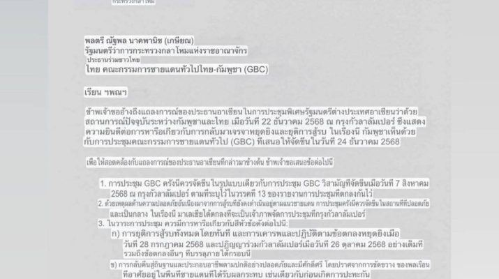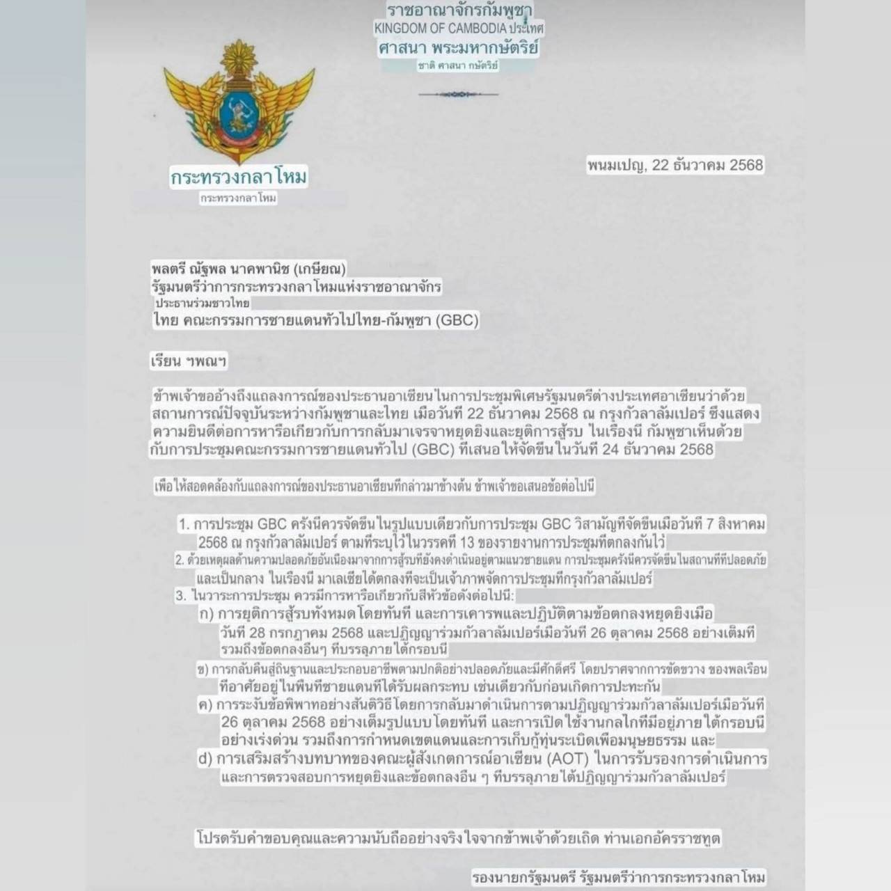 ทุกมุมทั่วไทย 24 ธันวาคม 2025 กลาโหมเขมร ร่อนหนังสือถึงกองทัพไทย ขอเจรจาอย่างเป็นทางการแล้ว หลังไทยเสนอ 3 ข้อให้เขมรประกาศหยุดยิง ก่อน หยุดการใช้กำลัง และร่วมเก็บกู้ทุ่นอย่างจริงจัง #แปลไทย Posted By: namchan