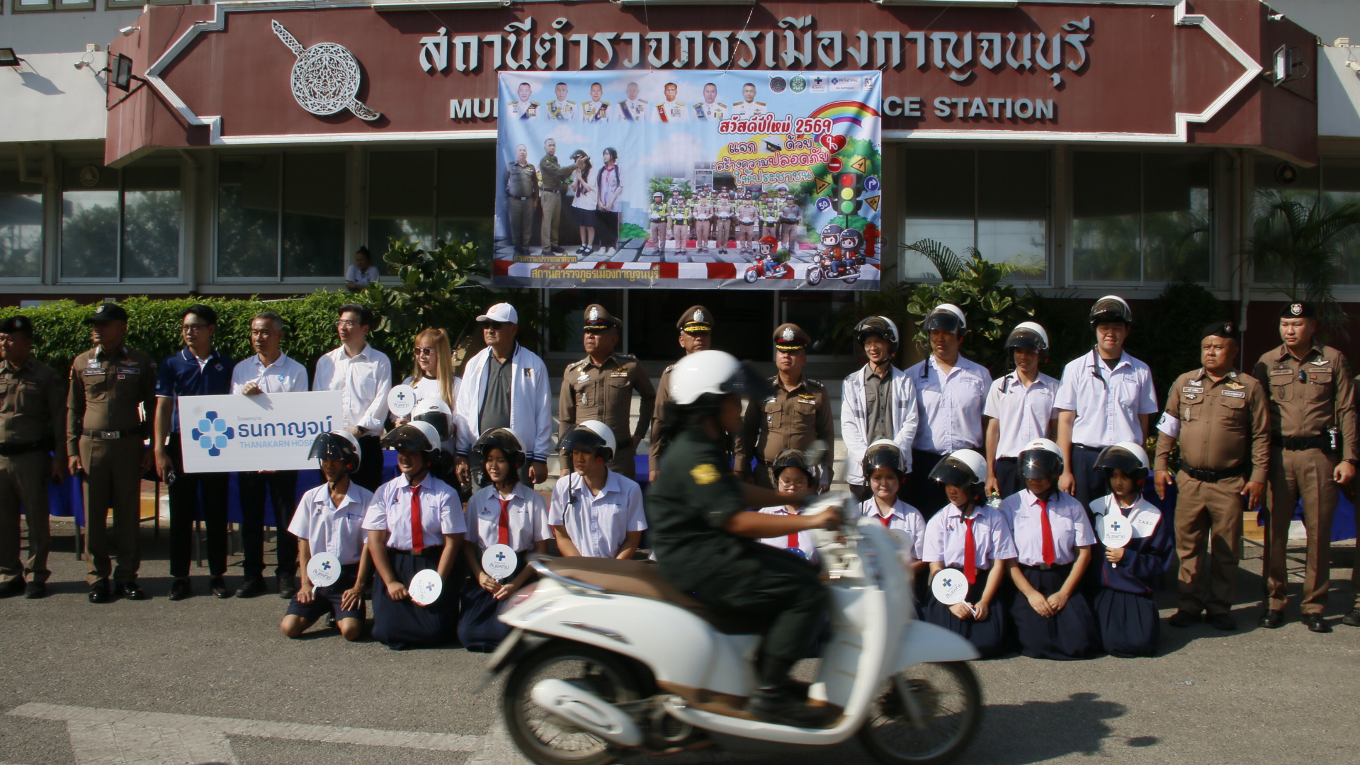 วันที่ 25 ธ.ค. 2568 ผู้สื่อข่าวรายงานว่า ที่บริเวณหน้า สภ.เมืองกาญจนบุรี พลตำรวจตรี พศวีร์ เรืองภู่ ผู้บังคับการตำรวจภูธรจังหวัดกาญจนบุรี พร้อมด้วยเจ้าหน้าที่จากโรงพยาบาลทั้งรัฐและเอกชน ที่สนับสนุนหมวกนิรภัย เข้าร่วมกันแจกหมวกนิรภัยให้กับนักเรียน นักศึกษา จากสถานศึกษาต่างๆในจังหวัดกาญจนบุรี รวมถึงประชาชนทั่วไป เดินทางไปร่วมรับหมวกนิรภัยในครั้งนี้อย่างเนื่องแน่น