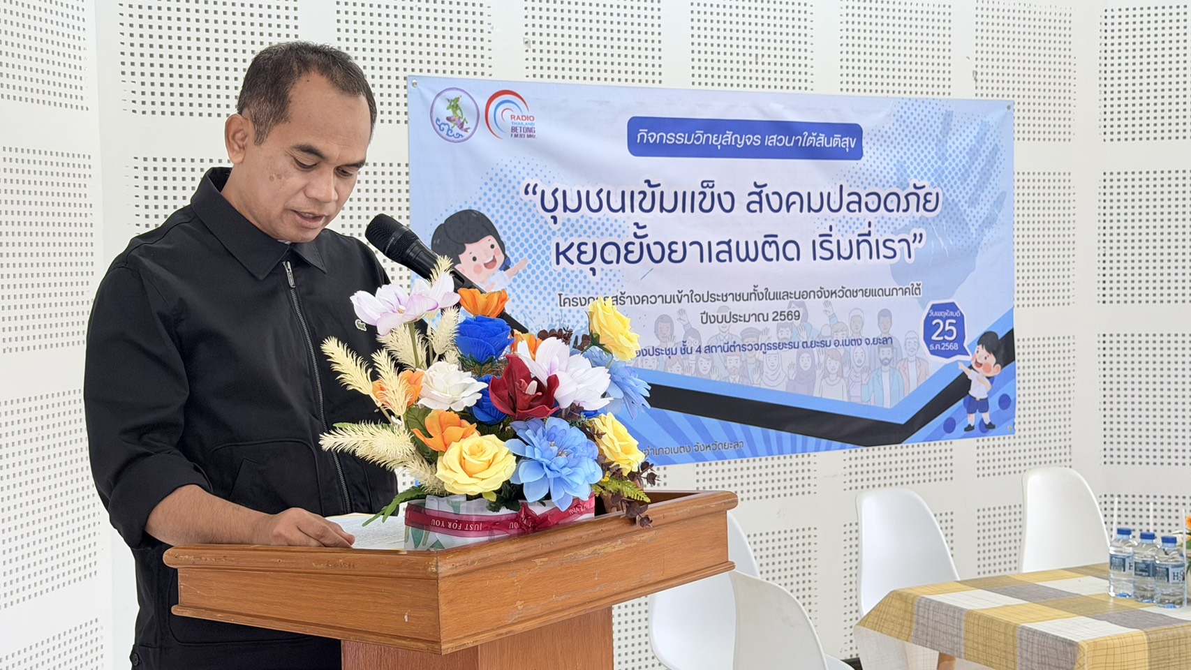 วันที่ 25 ธ.ค.68 ที่ห้องประชุม ชั้น 4 สถานีตำรวจภูธรยะรม ต.ยะรม อ.เบตง จ.ยะลา นายอิสสะมาแอ ยาโกะ นายอำเภอเบตงเป็นประธานในพิธีเปิดกิจกรรม วิทยุสัญจร เสวนาใต้สันติสุข “ชุมชนเข้มแข็ง สังคมปลอดภัย หยุดยั้งยาเสพติด เริ่มที่เรา” เพื่อให้เยาวชนและประชาชนได้รับข้อมูลที่ถูกต้องเกี่ยวกับสถานการณ์ยาเสพติด แนวทางการป้องกัน รวมถึงช่องทางการช่วยเหลือและบำบัดรักษา ตลอดจนเปิดพื้นที่แลกเปลี่ยนความคิดเห็นและข้อเสนอแนะระหว่างเยาวชน ผู้นำศาสนา และประชาชน เพื่อร่วมกันสร้างกลไกการป้องกันปัญหายาเสพติดในชุมชน โดยมีนางสาวซารีฮะ เจะดือราแม ผู้อำนวยการสถานีวิทยุกระจายเสียงแห่งประเทศไทยอำเภอเบตง หัวหน้าส่วนราชการ ผู้นำชุมชน ประชาชนและนักเรียนโรงเรียนจันทร์ประภัสสร์อนุสรณ์เข้าร่วมกิจกรรม พร้อมร่วมแสดงความคิดเห็น ให้ความรู้ คำแนะนำ ต่อปัญหายาเสพติดในพื้นที่ในการเสวนาครั้งนี้