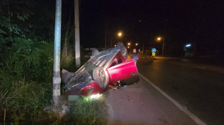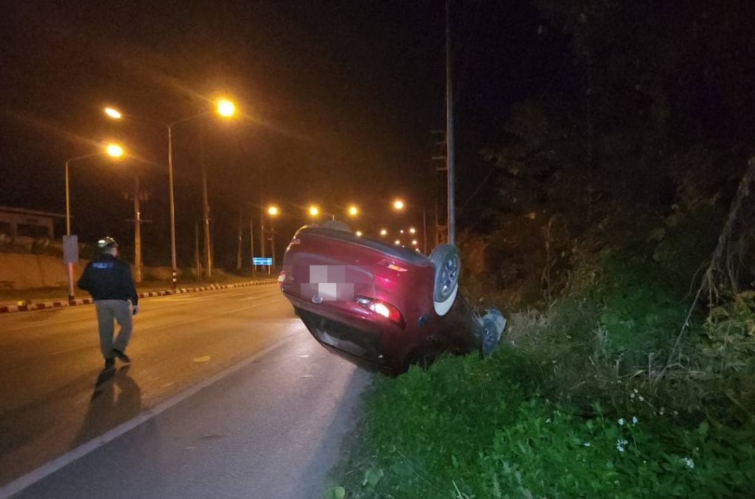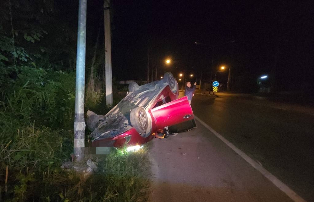 จากการตรวจสอบพบรถยนต์เก๋ง ยี่ห้อ Mazda 2 สีแดง ทะเบียน กรุงเทพมหานคร สภาพรถพลิกคว่ำ ล้อชี้ฟ้า ได้รับความเสียหายอย่างหนักทั้งคัน หลังชนเสาไฟฟ้าริมถนน