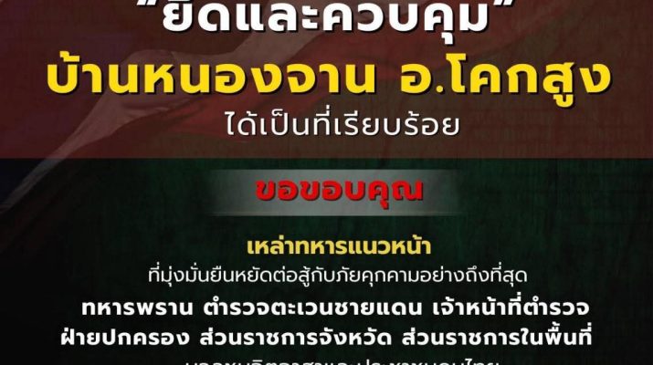 ศูนย์ปฏิบัติการกองทัพภาคที่ 1 ขอขอบคุณเหล่าทหารที่มุ่งมั่น ยืดหยัดต่อสู้กับภัยคุกคามอย่างถึงที่สุด ตลอดจนทุกภาคส่วนที่เกี่ยวข้อง ทหารพราน, ตำรวจตะเวนชายแดน, เจ้าหน้าที่ตำรวจ, ฝ่ายปกครอง ส่วนราชการจังหวัด, ส่วนราชการในพื้นที่, ประชาชนจิตอาสาทุกหมู่เหล่า และประชาชนคนไทยที่ส่งกำลังใจสนับสนุนภารกิจนี้มาโดยตลอด