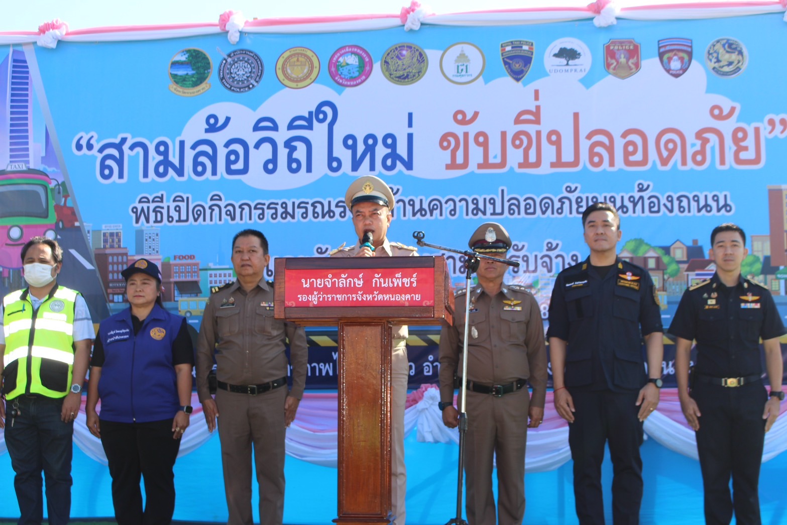 วันที่ 26 ธ.ค. 2568 ที่ บริเวณด่านพรมแดนสะพานมิตรภาพไทย-ลาว อ.เมืองหนองคาย นายจำลักษ์ กันเพ็ชร์ รองผู้ว่าราชการจังหวัดหนองคาย เป็นประธานเปิดปล่อยแถวจัดระเบียบรถสามล้อรับจ้างและการรณรงค์ความปลอดภัยทางถนนช่วงเทศกาลปีใหม่ โดยมี พ.ต.อ.จิรวิทย์ ปานยิ้ม ผกก.สภ.เมืองหนองคาย,พ.ต.ท.อดิศักดิ์ ทองหลาง รอง ผกก.ป.สภ.เมือง หนองคาย ,พ.ต.ท.เกษม สมสิน สวป.(ชส.)สภ.เมืองหนองคาย, พ.ต.ท.อาทร อาจหาญ สว.จร.สภ.เมืองหนองคาย