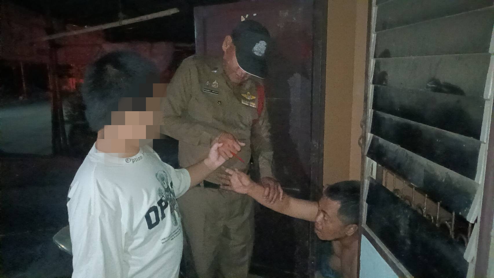 จากการสอบถามพูดคุยเด็กชายคนดังกล่าวถึงกับปวดหัวเพราะเด็กชายรูปร่างอ้วนไม่พูดจาอะไร ลักษณะคล้ายกับเด็กเป็นใบ้ และพลเมืองดีโทร.แจ้งตำรวจมาตรวจสอบ ต่อมาดาบตำรวจปรเมษฐ์ณกร ศรีประสงค์ สายตรวจจุดสกัดเครือสหพัฒน์มาตรวจสอบจากการสอบถามเด็กไม่สามารถพูดคุยได้ พยายามสอบถามเด็กนานกว่าชั่วโมงเด็กก็ไม่พูด กระทั่งเวลา 10.15 น.ทราบว่าพบพ่อเด็กอยู่หอพักแห่งหนึ่งห่างจากเซเว่น 1 กิโลเมตรจึงพาไปพบผู้เป็นพ่อตามที่ได้รับแจ้งเมื่อไปถึงหน้าห้องหมายเลขที่ 12 พบชายวัยกลางคนอยู่ในสภาพพูดจาไม่รู้เรื่องลักษณะคล้ายคนเมาสุรา นั่งอยู่ภายในห้องได้แต่ยื่นมือออกมาจากห้องและกวักมือหาลูกชาย