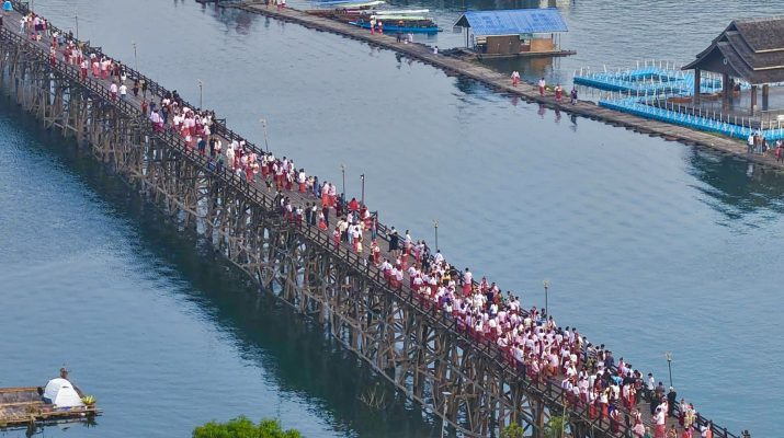 ผู้สื่อข่าวรายงานว่า บริเวณสะพานไม้อุตมะนุสรณ์(สะพานไม้) สะพานไม้ยาวอันดับ 2 ของโลก แหล่งท่องเที่ยวที่มีขึ้นชื่อเสียงโด่งดังไปทั่วโลก หมู่ 2 ตำบลหนองลู อำเภอสังขละบุรี จังหวัดกาญจนบุรี นักท่องเที่ยวแน่นเต็มสะพานไม้