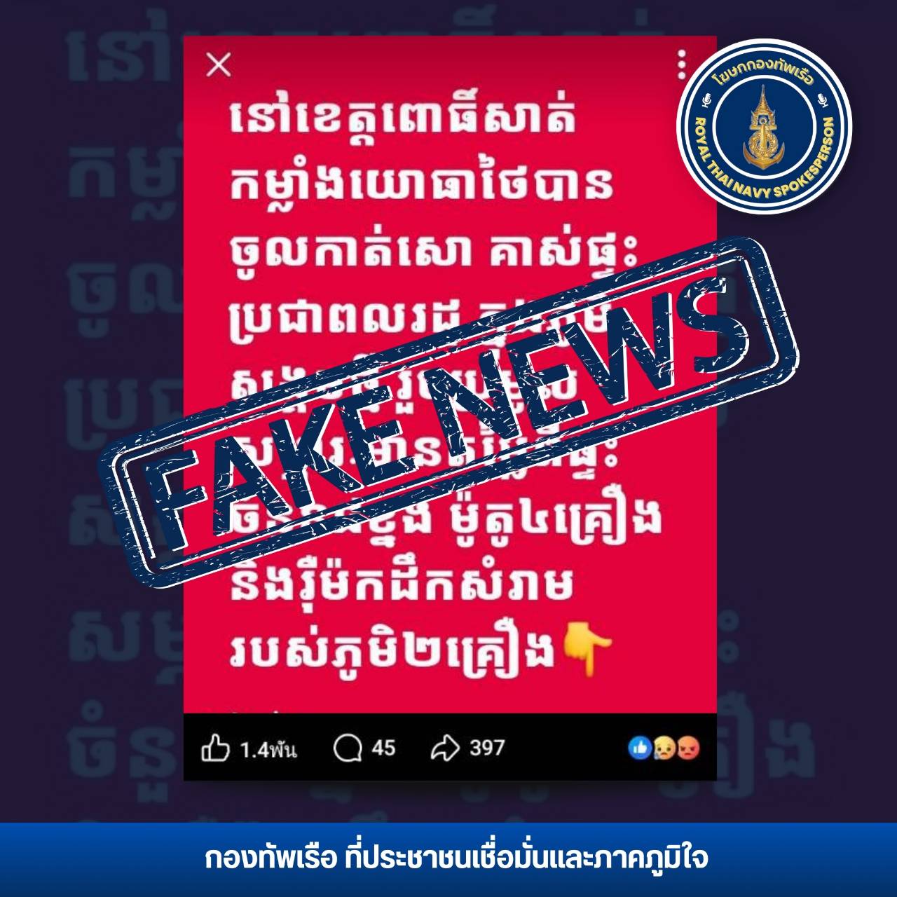 พลเรือตรี ปารัช รัตนไชยพันธ์ โฆษกกองทัพเรือ เปิดเผยว่า ตามที่มีการเผยแพร่ข้อมูลและข่าวสารทางสื่อสังคมออนไลน์ซึ่งอาจก่อให้เกิดความเข้าใจว่า กำลังพลของกองทัพเรือภายหลังการยึดคืนพื้นที่ ได้มีการนำทรัพย์สินมีค่าของทหารหรือประชาชนชาวกัมพูชาไปเป็นของตนเองนั้น สำนักงานโฆษกกองทัพเรือขอเรียนชี้แจงต่อประชาชนชาวกัมพูชาว่า ข้อมูลดังกล่าว ไม่เป็นความจริง