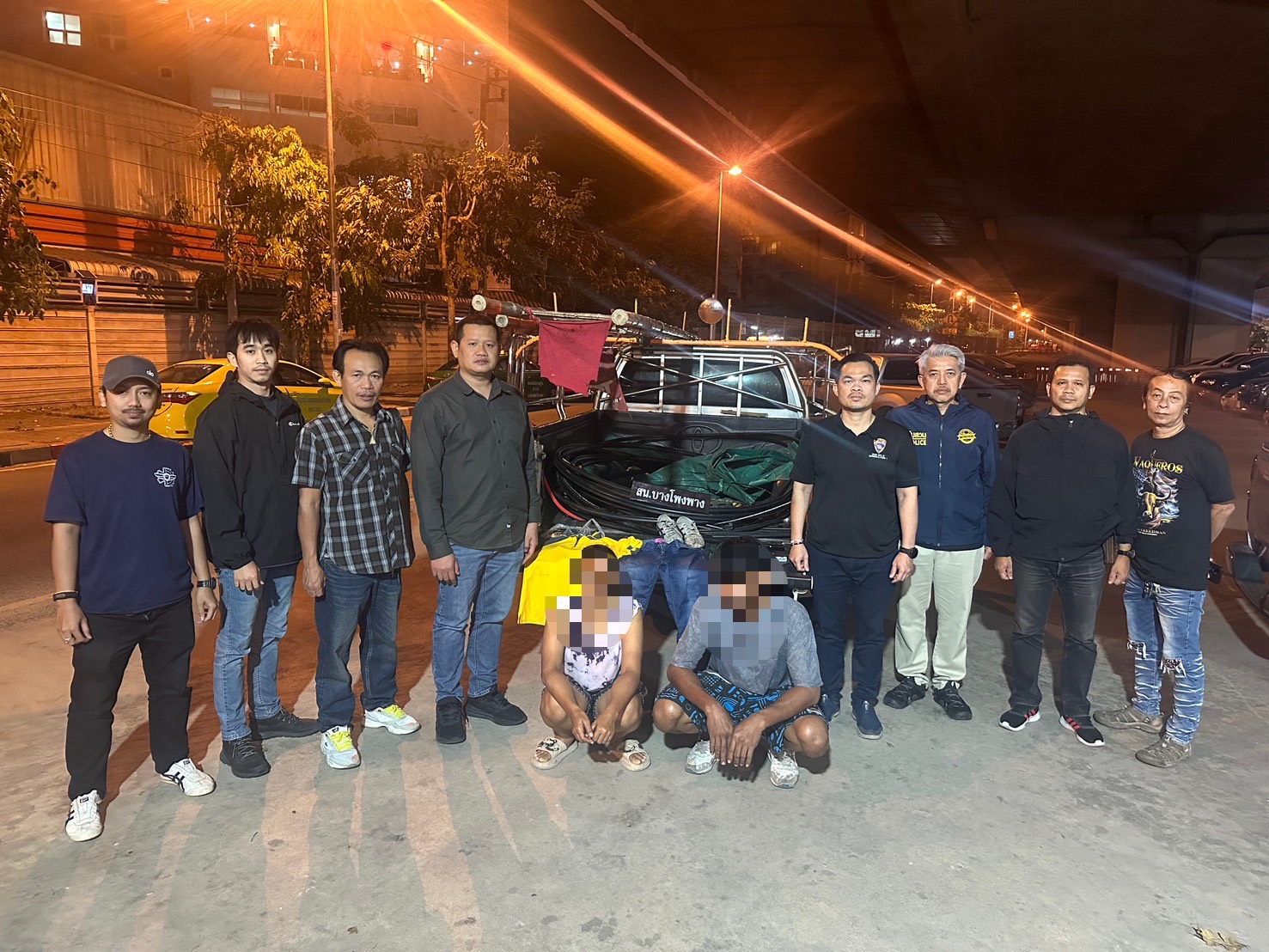 ร่วมกันจับกุม นายสมพงษ์ (สงวนนามสกุล) อายุ 41 ปี และ น.ส.วราภรณ์ (สงวนนามสกุล) อายุ 46 ปี พร้อมของกลาง รถกระบะ โตโยต้า สีขาว ทะเบียนพิษณุโลก บันไดไม้ 2 อัน สายเคเบิลพร้อมลวด คีมตัดท่อน้ำ 2 อัน มีดคัตเตอร์ 1 อัน ที่หน้าบ้านหลังหนึ่ง ในซอยเศรษฐกิจ แขวงบางแคเหนือ เขตบางแค กรุงเทพมหานคร เมื่อวันที่ 5 ม.ค. เวลา 17.00 น. ที่ผ่านมา