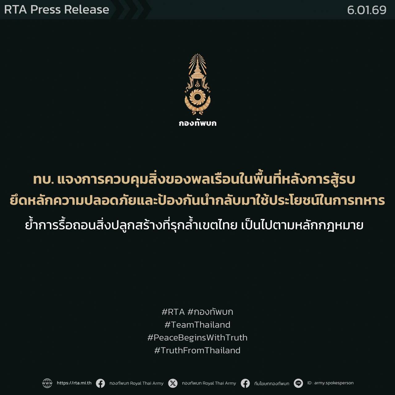 ทั้งนี้ ยืนยันว่าทุกการปฏิบัติการของกองทัพไทย อยู่ภายใต้กรอบกฎหมายมนุษยธรรมระหว่างประเทศ เพื่อมุ่งรักษาความสงบเรียบร้อย และความปลอดภัยของประชาชนเป็นสำคัญ