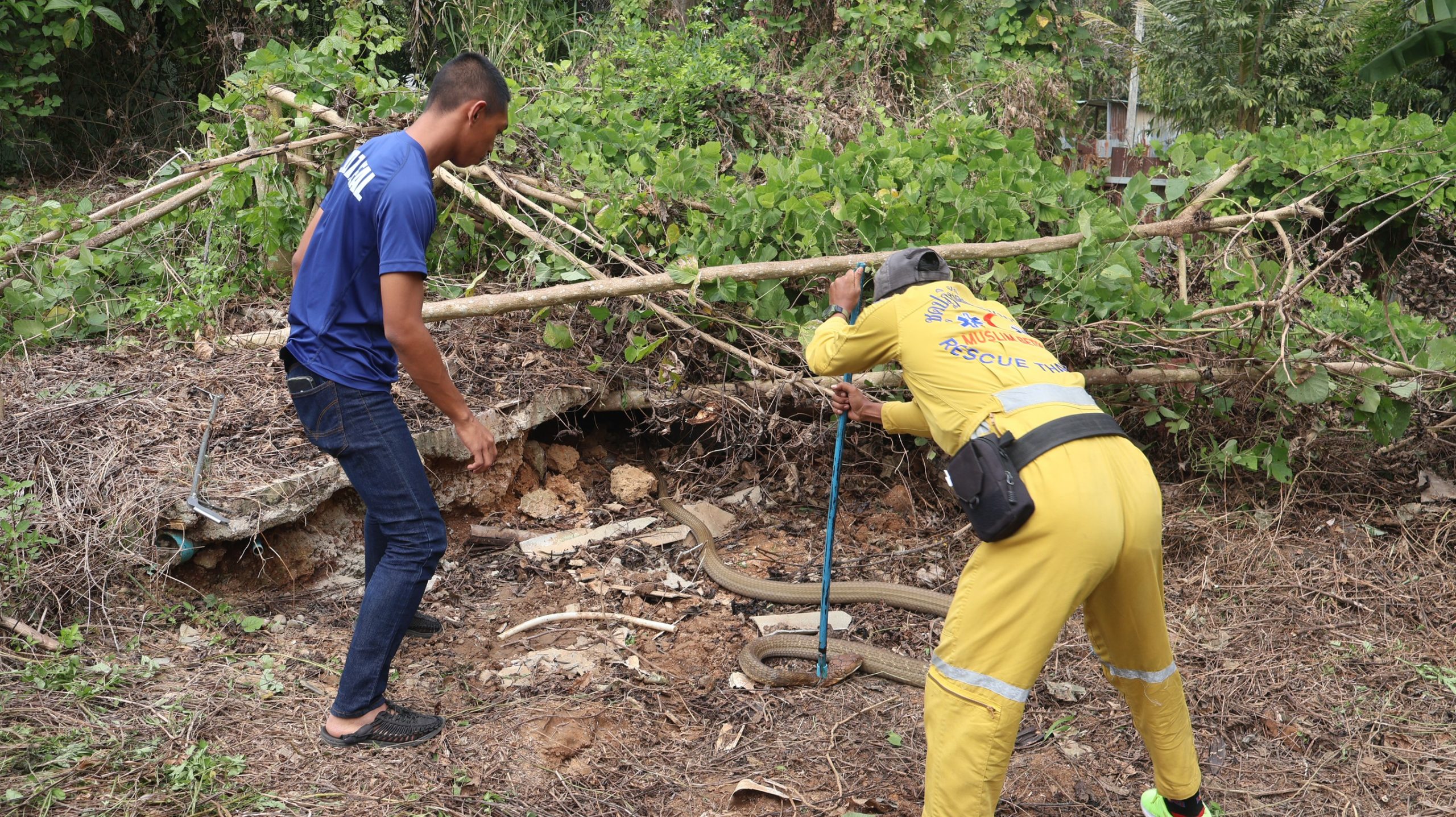 วันที่ 6 ม.ค.69 น.ส.พัชรรินทร์ ประทุมเมฆ ประธานชมรมคนรักสัตว์เบตง ได้รับแจ้งขอความช่วยเหลือจากชาวบ้านว่า พบงูจงอางอยู่ในโพรง บริเวณบ้านสวรรค์บนดอย ม.1 ต.ยะรม อ.เบตง จ.ยะลา จึงประสาน นายโยธิน ประชามติรัฐ หัวหน้าชุดปฏิบัติการกู้ชีพกู้ภัยมุสลิมเบตง ให้ส่งอาสาสมัครกู้ชีพกู้ภัยมุสลิมเบตง นำอุปกรณ์การจับงู เข้าช่วยเหลือ เมื่อเดินทางไปถึงพบว่า มีงูจงอาง 2 ตัว อยู่ในโพรง ใต้พื้นห้องน้ำเก่า ซึ่งมีหญ้าปกคลุมอยู่ อาสาสมัครกู้ภัยจึงใช้ความระมัดระวังเป็นอย่างมากเพราะมี งูจงอางถึง 2 ตัว อยู่ภายใน