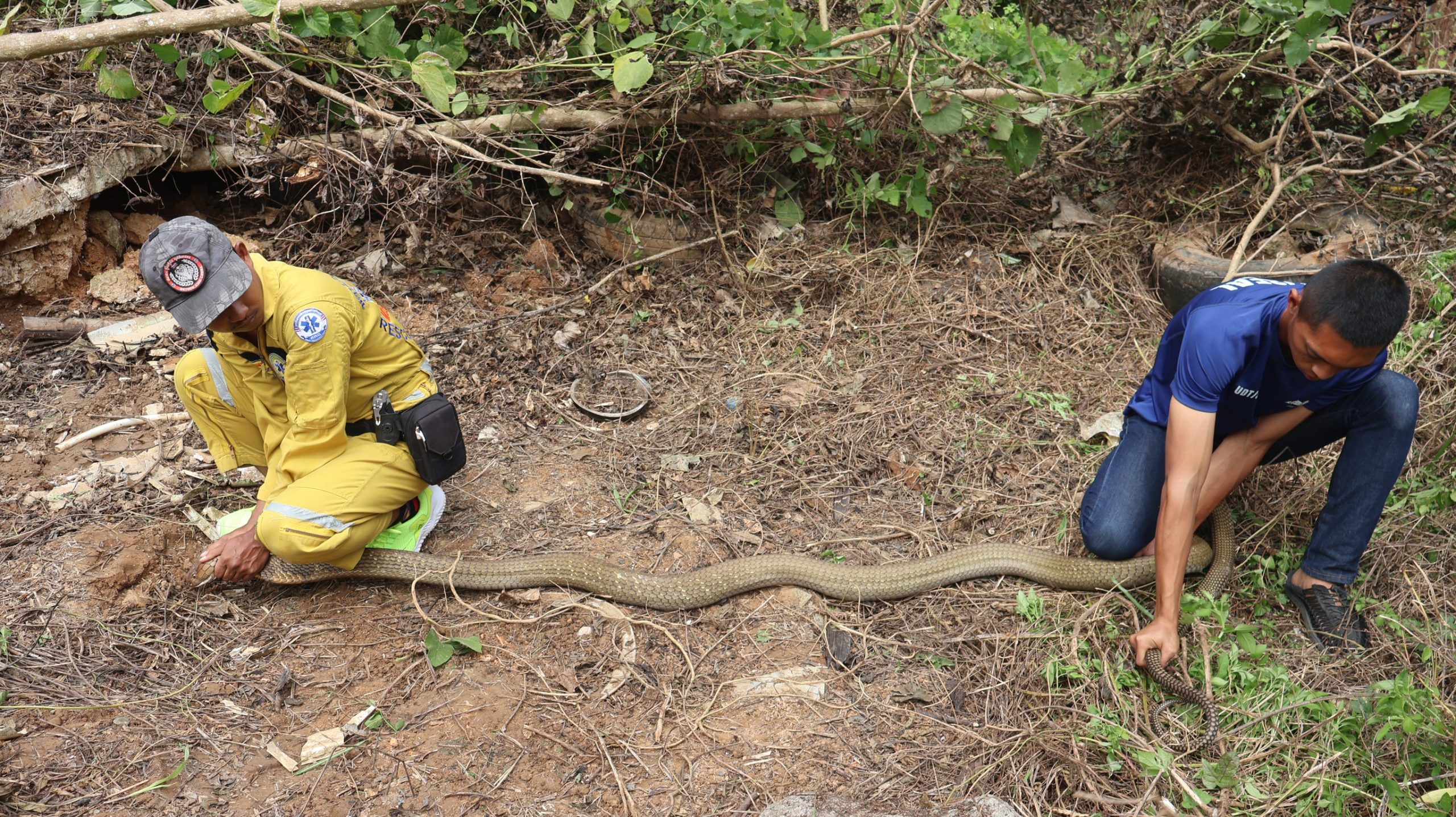 ขณะที่อาสาสมัครกู้ภัยพยายามเอาบ่วงคล้องคองู มีงูตัวหนึ่ง เลื้อยหนีเข้าไปในโพรงด้านหลังซึ่งเป็นป่า ส่วนตัวที่ถูกจับมีขนาดความยาวประมาณ 4 เมตร หนักประมาณ 10 กิโลกรัม ซึ่งสร้างความแตกตื่นให้กับชาวบ้านบริเวณนั้นเป็นอย่างมาก เพราะมีขนาดตัวที่ใหญ่ อาสาสมัครกู้ภัย พยายามค้นหางูอีกตัวที่เลื้อยหนีไปอยู่ประมาณครึ่งชั่วโมง แต่ก็ไม่พบ คาดว่าคงเลื้อยหนีเข้าป่าไปแล้ว