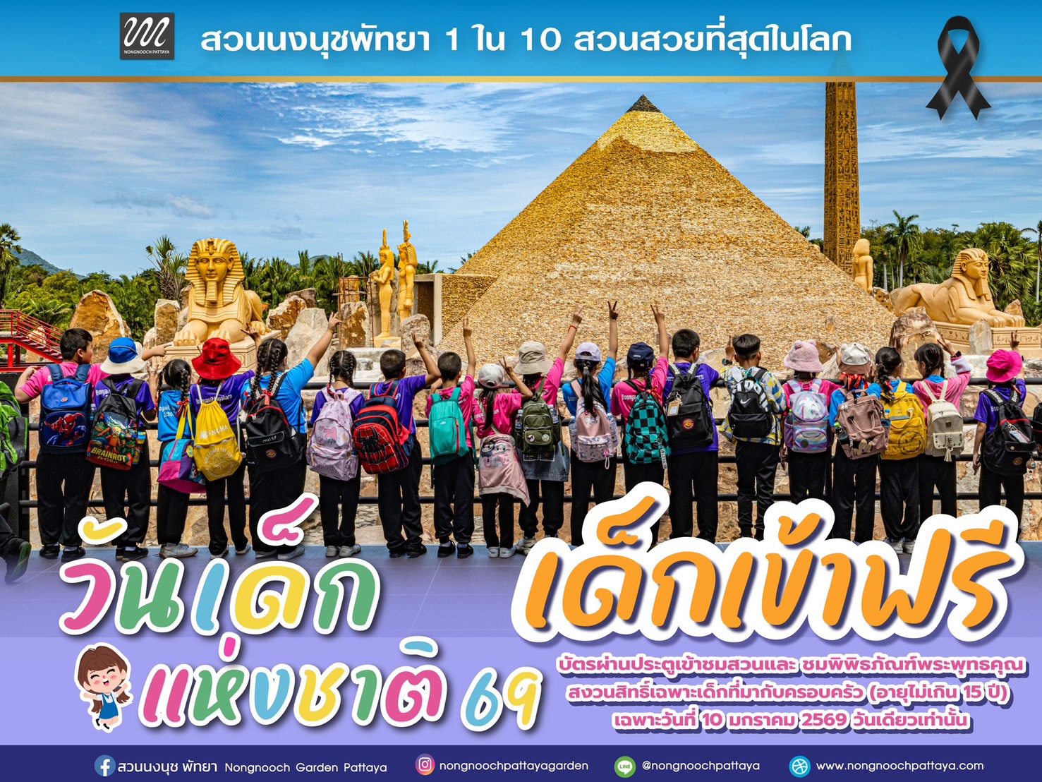 ในวันเสาร์ที่ 10 มกราคม 2569 สวนนงนุชพัทยา มอบสิทธิพิเศษให้เด็กและเยาวชนที่มากับครอบครัวเข้าชมสวนฟรี (สำหรับเด็กอายุไม่เกิน 15 ปี) เพียงแสดงบัตรประชาชน หรือเอกสารยืนยันอายุ ก็สามารถเข้าชมสวนนงนุชพัทยาได้โดยไม่เสียค่าใช้จ่าย พร้อมรับสิทธิพิเศษเข้าชมพิพิธภัณฑ์พระพุทธคุณฟรี เพื่อปลูกฝังคุณธรรมและจิตสำนึกที่ดีให้แก่เยาวชน