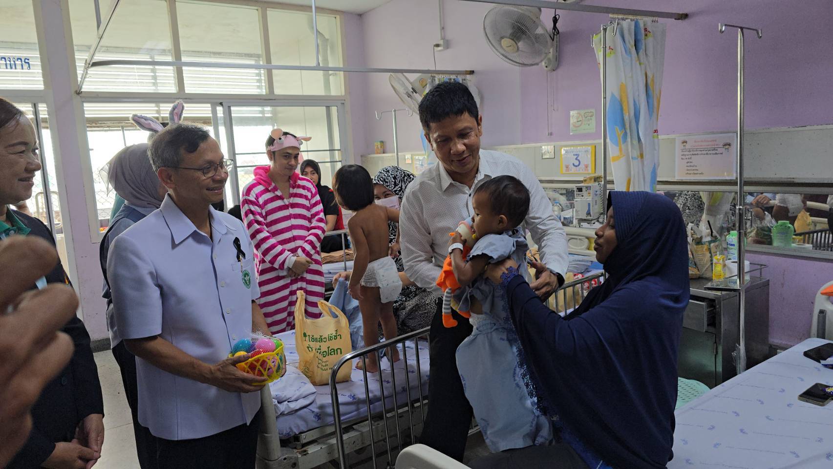 วันที่ 9 ม.ค. 69 ที่ อาคารเปี่ยมสุข 4 แผนกกุมารเวชกรรม โรงพยาบาลนราธิวาสราชนครินทร์ อำเภอเมือง จังหวัดนราธิวาส นายบุญช่วย หอมยามเย็น ผู้ว่าราชการจังหวัดนราธิวาส พร้อมด้วยผู้อำนวยการโรงพยาบาลนราธิวาสราชนครินทร์ พัฒนาสังคมและความมั่นคงของมนุษย์จังหวัดนราธิวาส และประชาสัมพันธ์จังหวัดนราธิวาส นำทีมพี่หมอและพยาบาลใจดี ร่วมกันส่งความสุข นำของขวัญมามอบเป็นกำลังใจให้กับผู้ป่วยเด็กที่ต้องนอนพักรักษาในโรงพยาบาล ในช่วงเทศกาลวันเด็กแห่งชาติ ประจำปี 2569 โดย ผู้ว่าราชการจังหวัดนราธิวาส พร้อมทีมคุณหมอและพยาบาลจากโรงพยาบาลนราธิวาสราชนครินทร์ และพี่ๆ ทหารจากชุดควบคุมสันติสุขที่ 401 ซึ่งได้แต่งกายด้วยชุดมาสคอส ตัวการ์ตูน สีสันสดใส ที่เด็กๆ ชื่นชอบ ร่วมกันนำของขวัญสุดพิเศษ ประกอบด้วย ตุ๊กตา, ฟุตบอล,อุปกรณ์เครื่องเขียน ชุดระบายสี และของเล่นต่างๆ เพื่อเสริมสร้างพัฒนาการทางสมอง มาแจกจ่ายมอบให้แก่เด็กๆ ที่เจ็บป่วยและต้องพักรักษาตัวในโรงพยาบาล ทำให้พลาดโอกาสในการไปร่วมงานวันเด็กแห่งชาติในวันเสาร์ที่ 10 มกราคมนี้