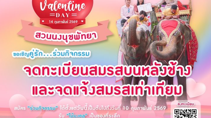 สวนนงนุชพัทยา เปิดรับสมัครคู่รัก ร่วมจดทะเบียนสมรสบนหลังช้าง ครั้งหนึ่งในชีวิตที่น่าจดจำ วาเลนไทน์ 14 กุมภาพันธ์ 2569 จำนวนจำกัด!