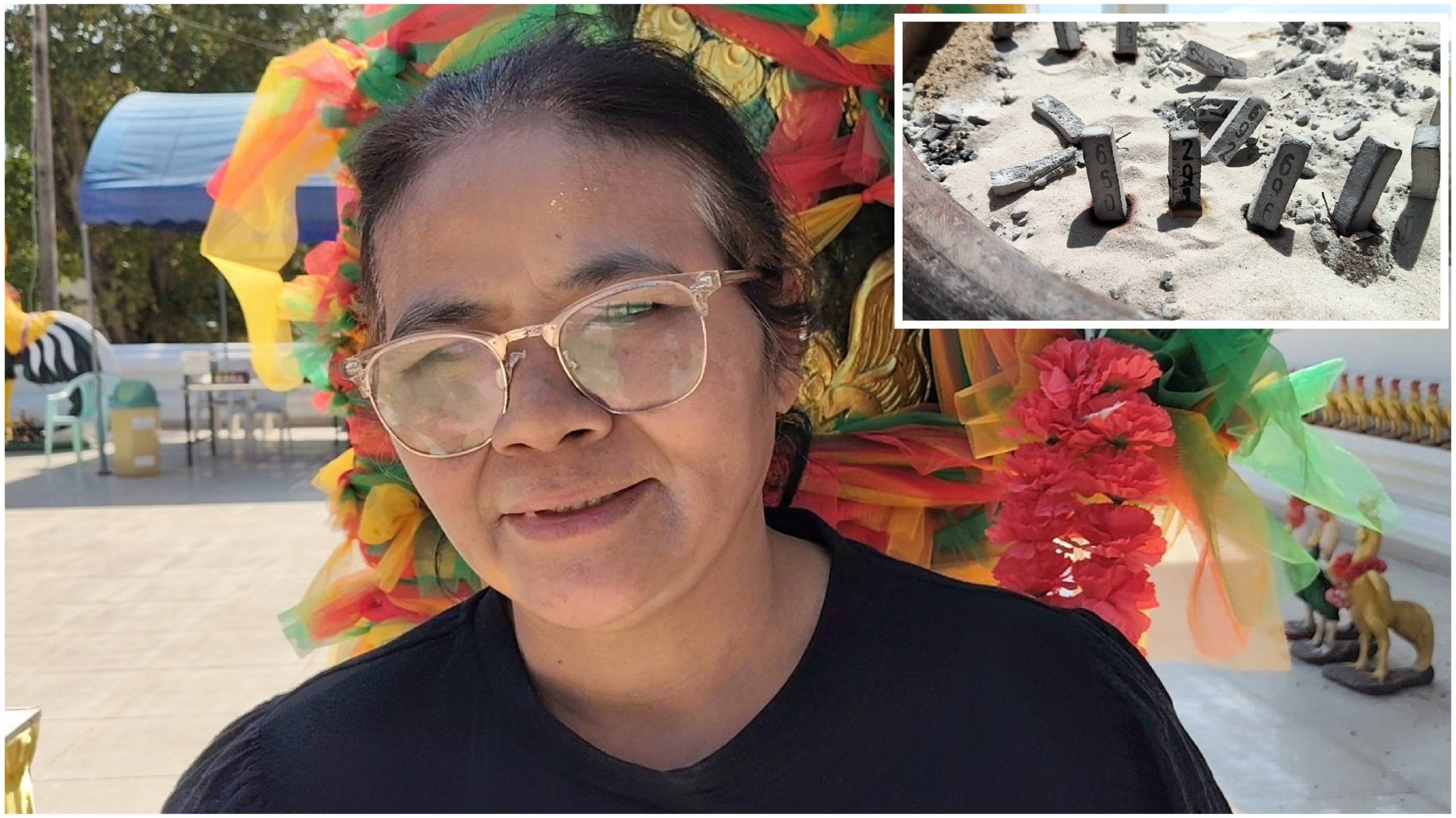 เมื่อเดินทางมาถึง คุณยายเพ็ญรู้สึกประทับใจกับบรรยากาศภายในวัดที่สะอาด ร่มรื่น รวมถึงพญานาคที่ประดับอยู่ริมทางเดินซึ่งมีความสวยงาม ทำให้เกิดความศรัทธายิ่งขึ้น สำหรับการมาครั้งนี้คุณยายเพ็ญได้ตั้งจิตอธิษฐานขอพรให้ถูกรางวัลเลขท้าย 3 ตัว และหากเป็นไปได้ก็ขอให้ถูกรางวัลที่ 1 และหากสมปรารถนา ตนจะกลับมาทอดผ้าป่าหรือทอดกฐินถวายวัด แต่หากถูกรางวัลเพียงเลขท้าย 3 ตัว ก็จะซื้อนาฬิกาข้อมือมาถวายไอ้ไข่วัดบึงบา นอกจากนี้ ก่อนเดินทางกลับ คุณยายเพ็ญยังได้ลองลุ้นโชคโดยการล้วงลูกบอลจากไหทองคำได้เลข 605 เพื่อนำไปลุ้นโชคในการออกรางวัลงวดที่จะถึงนี้อีกด้วย