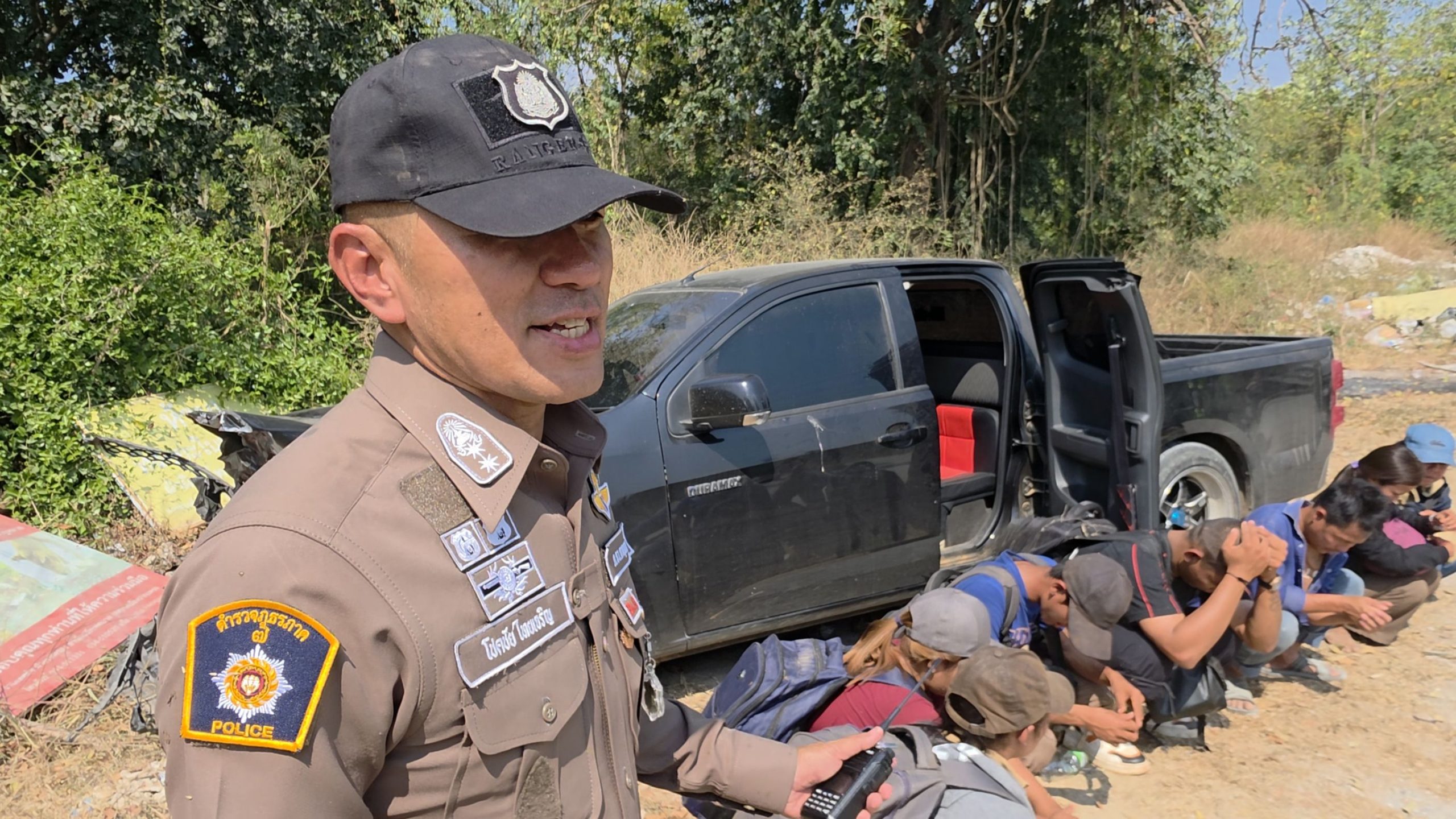 ต่อมา พันตำรวจโทโชคชัย ไทยเจริญ รอง ผกก.จร.สภ.เมืองกาญจนบุรี พร้อมด้วย พันตำรวจตรีเวชยัณ ปิยภิรมย์ สวป.เมืองกาญจนบุรี นำกำลังจราจรและสายตรวจร่วมระดมกำลังปิดล้อมป่าค้นหาใช้เวลา 20 นาที จนพบแรงงานชาวเมียนมาหลบหนีเข้าเมือง 7 คน (ช.4 ญ.3) นั่งหลบในป่า ตรวจสอบรถกระบะที่ชนแล้วหนีมีกระเป๋าสัมภาระที่ท้ายกระบะ ในรถพบเอกสารพาสปอร์ตบางส่วน ไม่พบตัวคนขับคาดใช้ความชำนาญวิ่งหลบหนีไปได้หวุดหวิด
