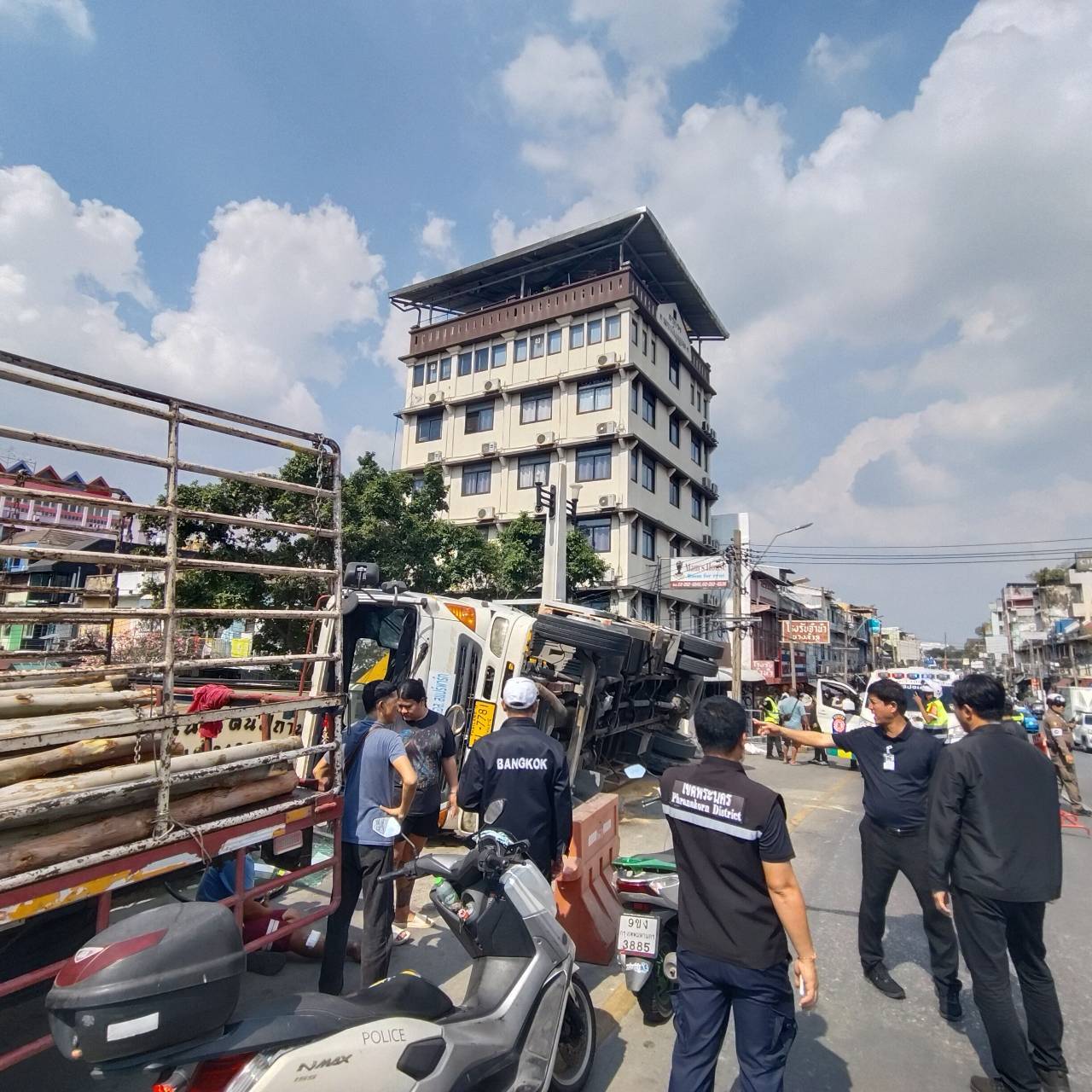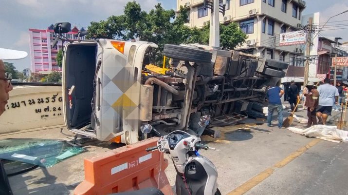 ที่เกิดเหตุอยู่บนสะพานพบรถบรรทุกพ่วง 6 ล้อ ยี่ห้อฮีโน่ เมก้า ทะเบียนป้ายเหลือง หมวดจังหวัดปทุมธานี สภาพล้มคว่ำตะแคงอยู่บนฟุตปาธขอบสะพาน ด้านหลังใช้บรรทุกรถเครนเล็ก เกือบตกลงไปในคลอง มีน้ำมันรั่วไหลบนพื้นถนน เจ้าหน้าที่สำนักงานเขตได้นำทรายมากลบ ที่เกิดเหตุพบมีผู้ได้รับบาดเจ็บ รวม 2 ราย 1 ราย อายุประมาณ 28 ปี มีอาการเจ็บหน้าอก อาสาสมัครนำส่งโรงพยาบาลกลาง นอกจากนี้ยังมีผู้ได้รับบาดเจ็บอีก จำนวน 1 ราย เป็นเพศชาย อายุประมาณ 20 ปี บาดเจ็บเล็กน้อย ปฐมพยาบาลในที่เกิดเหตุ ไม่ประสงค์ไปโรงพยาบาล
