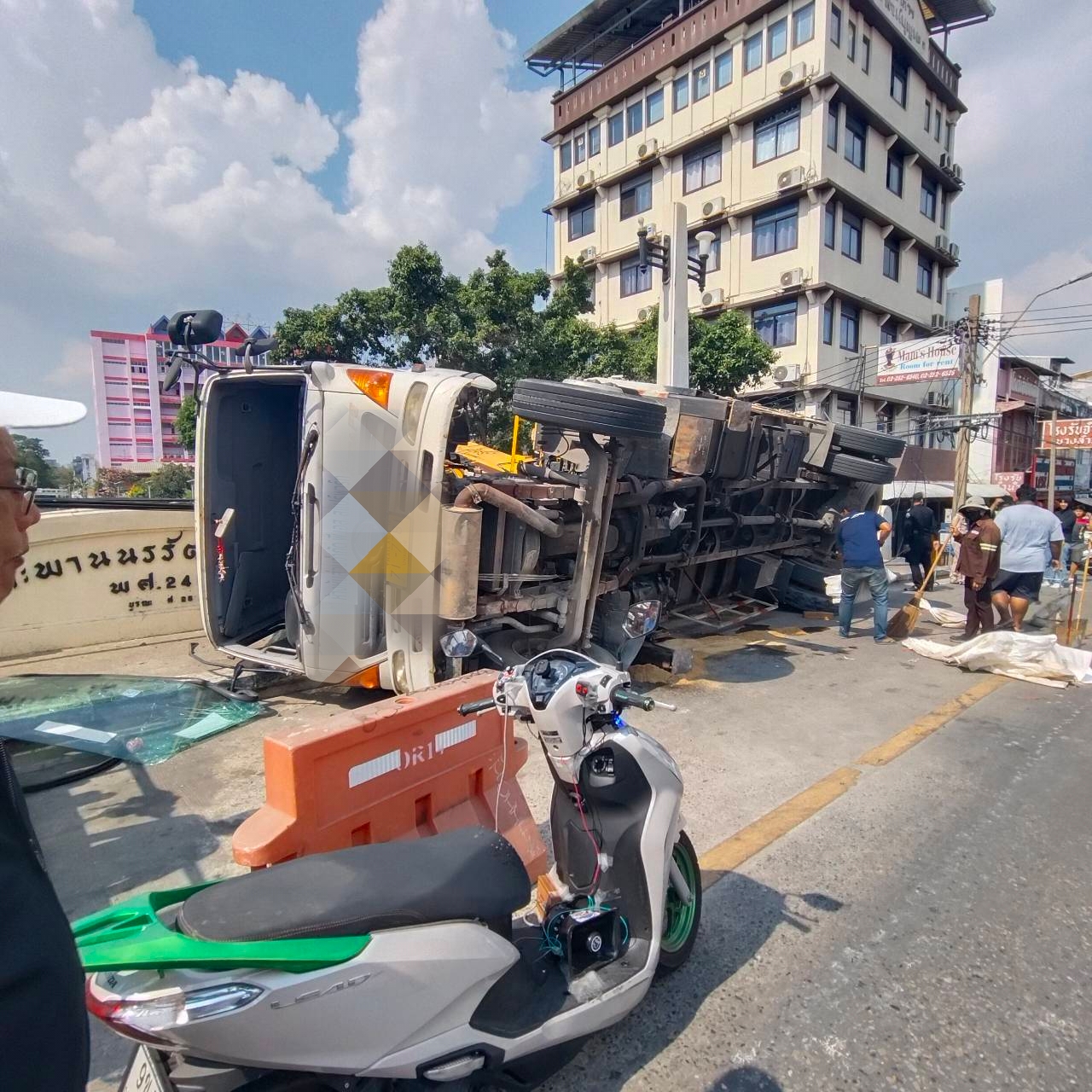 ที่เกิดเหตุอยู่บนสะพานพบรถบรรทุกพ่วง 6 ล้อ ยี่ห้อฮีโน่ เมก้า ทะเบียนป้ายเหลือง หมวดจังหวัดปทุมธานี สภาพล้มคว่ำตะแคงอยู่บนฟุตปาธขอบสะพาน ด้านหลังใช้บรรทุกรถเครนเล็ก เกือบตกลงไปในคลอง มีน้ำมันรั่วไหลบนพื้นถนน เจ้าหน้าที่สำนักงานเขตได้นำทรายมากลบ ที่เกิดเหตุพบมีผู้ได้รับบาดเจ็บ รวม 2 ราย 1 ราย อายุประมาณ 28 ปี มีอาการเจ็บหน้าอก อาสาสมัครนำส่งโรงพยาบาลกลาง นอกจากนี้ยังมีผู้ได้รับบาดเจ็บอีก จำนวน 1 ราย เป็นเพศชาย อายุประมาณ 20 ปี บาดเจ็บเล็กน้อย ปฐมพยาบาลในที่เกิดเหตุ ไม่ประสงค์ไปโรงพยาบาล