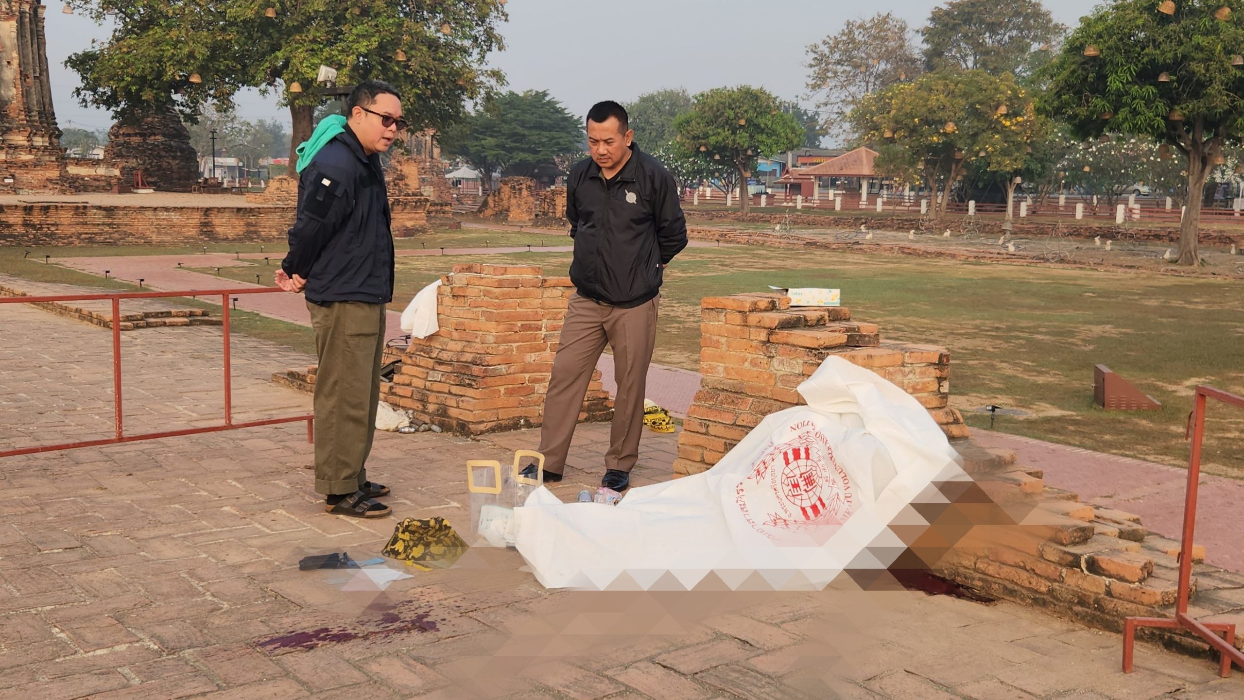 เจ้าหน้าที่ได้กั้นเชือกห้ามผู้ที่ไม่เกี่ยวข้องเข้าในพื้นที่ เพื่อทำการตรวจสอบอย่างละเอียด จากการสอบถาม นายอุรกฤษฎ์ มีชูสิน ผู้ดูแลโบราณสถาน ให้การว่า ตนเข้าเวรตั้งแต่ช่วงกลางคืน และได้เดินตรวจตราความเรียบร้อยบริเวณดังกล่าวในช่วงเวลาประมาณเที่ยงคืน แต่ไม่พบสิ่งผิดปกติ กระทั่งช่วงเช้าประมาณ 06.00 น. ได้เข้าตรวจสอบอีกครั้ง พบหญิงนอนพิงกำแพงโบราณสถานในลักษณะเสียชีวิตแล้ว จึงรีบแจ้งเจ้าหน้าที่ตำรวจและหน่วยงานที่เกี่ยวข้องเข้าตรวจสอบ