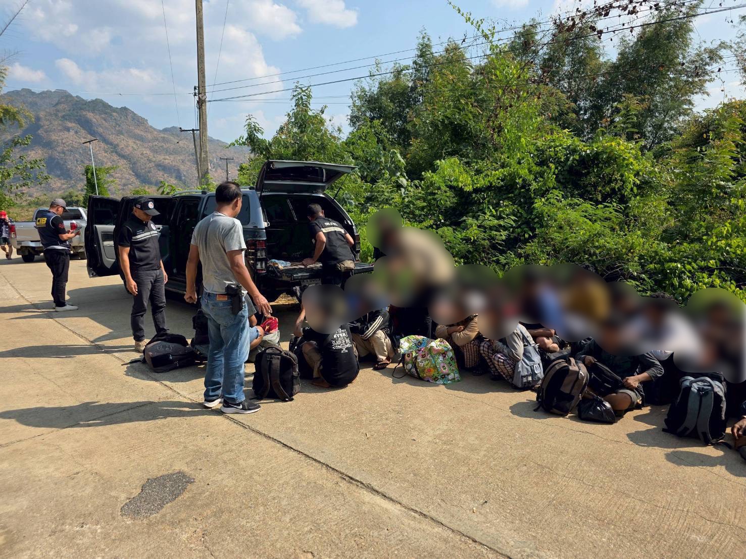 ต่อมา เวลา 14.05 น. ขณะที่เจ้าหน้าที่กำลังตั้งจุดตรวจจุดสกัด ได้รับแจ้งจากสายข่าวว่าพบรถยนต์กระบะต้องสงสัย จำนวน 3 คัน ขับหลบหนีเจ้าหน้าที่เข้าไปยังบริเวณวัดพุพง ม.5 ต.ท่าเสา อ.ไทรโยค จ.กาญจนบุรี และรถยนต์ต้องสงสัยอีก จำนวน 1 คัน ขับมุ่งหน้าไปตามเส้นทางหลวงหมายเลข 323 จึงได้จัดกำลังไล่ติดตามรถยนต์ดังกล่าวไป เวลาต่อมา เจ้าหน้าที่สามารถสกัดจับรถยนต์ได้ทั้งหมด 4 คัน จึงเข้าทำการตรวจค้น พบ นายมอน ซาน อายุ 38 ปี สัญชาติเมียนมา เป็นผู้ขับขี่รถยนต์กระบะ ยี่ห้อ Isuzu รุ่น D-max สีเทา หมายเลขทะเบียน กาญจนบุรี,นายสมเกียรติ อายุ 38 ปี สัญชาติไทย เป็นผู้ขับขี่รถยนต์กระบะ ยี่ห้อ Ford รุ่น Ranger สีดำ หมายเลขทะเบียน กรุงเทพมหานคร นายชา อายุ 38 ปี สัญชาติไทย เป็นผู้ขับขี่รถยนต์กระบะ ยี่ห้อ Toyota รุ่น Revo สีบรอนซ์ หมายเลขทะเบียน ชลบุรี และรถยนต์กระบะ ยี่ห้อ Isuzu รุ่น D-max สีบรอนซ์ทอง หมายเลขทะเบียน สุพรรณบุรี เจ้าหน้าที่จึงได้ทำการตรวจค้นอย่างละเอียด พบว่ารถยนต์ทั้ง 4 คัน บรรทุกแรงงานต่างด้าวผิดกฎหมาย จำนวนทั้งสิ้น 86 คน แบ่งเป็น ชาย 57 คน หญิง 29 คน โดยทั้งหมดให้การยอมรับสารภาพว่า พวกตนเดินทางมาจาก รัฐย่างกุ้ง และเมืองพะโค ประเทศเมียนมา ลักลอบหลบหนีเข้ามายังประเทศไทยด้วยวิธีการเดินเท้าเข้ามาตามช่องทางธรรมชาติ หลังจากนั้นได้ใช้เส้นทางทางน้ำ และเดินลัดเลาะอ้อมจุดตรวจจุดสกัดของเจ้าหน้าที่ฝ่ายความมั่นคง แล้วมุ่งหน้าเข้าสู่ประเทศไทยตอนใน เพื่อจะเดินทางไปทำงานในพื้นที่ จ.สมุทรสาคร โดยจะเสียค่าใช้จ่ายให้กับนายหน้าคนละ 12,000 – 20,000 บาท เมื่อถึงปลายทาง แต่ถูกเจ้าหน้าที่จับกุมได้เสียก่อน หลังจากนั้นเจ้าหน้าที่จึงนำตัวผู้กระทำความผิดพร้อมของกลาง ส่ง สภ.ไทรโยค เพื่อดำเนินคดีตามกฎหมายต่อไป