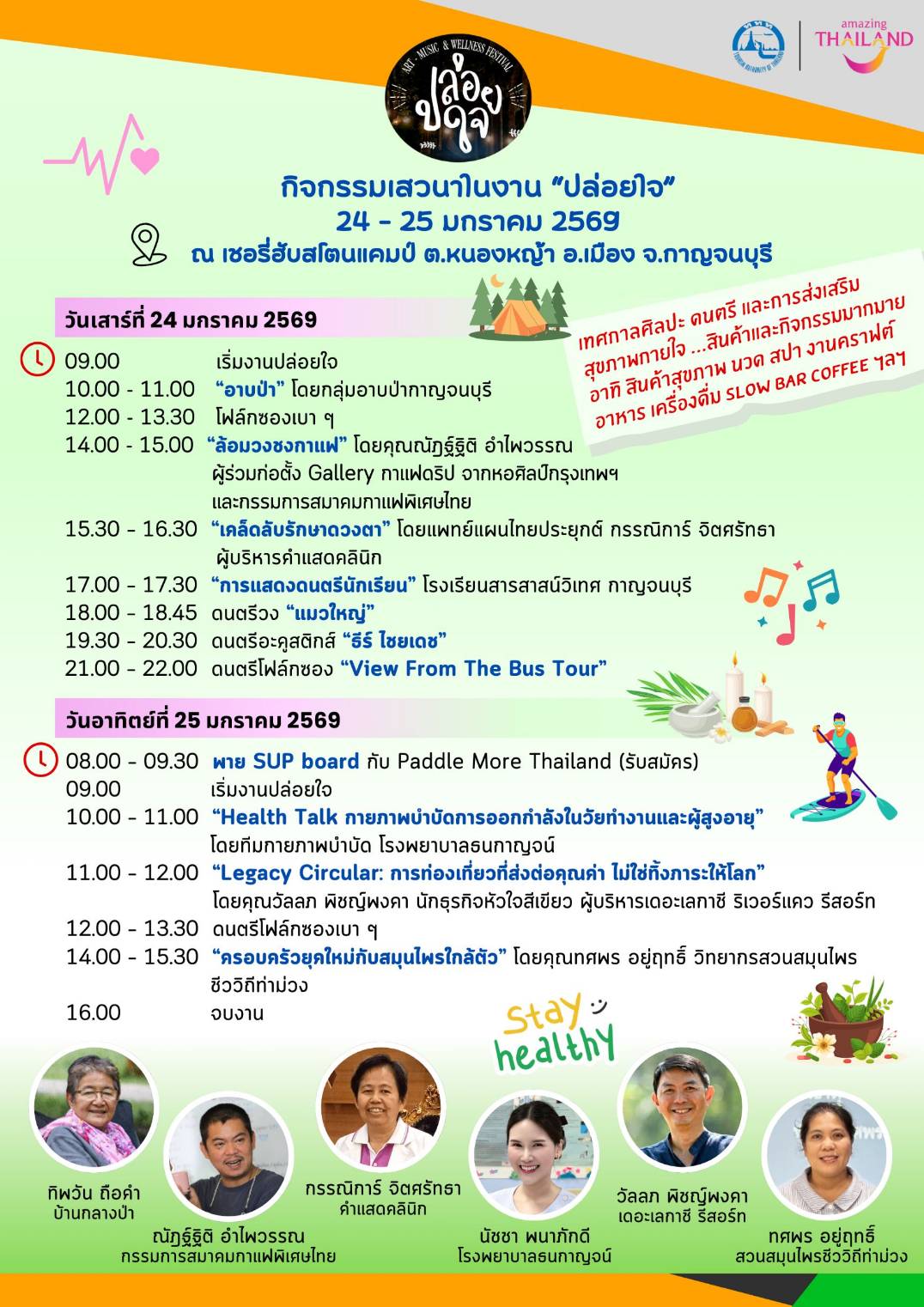 วันที่ 24 – 25 มกราคม 2569 ผู้สื่อข่าวรายงานว่า ททท. สำนักงานการท่องเที่ยวกาญจนบุรี ร่วมกับผู้ประกอบการ จัดกิจกรรมท่องเที่ยวเชิงสุขภาพ รวมถึงกิจกรรมมากมาย ณ กาญจนบุรี