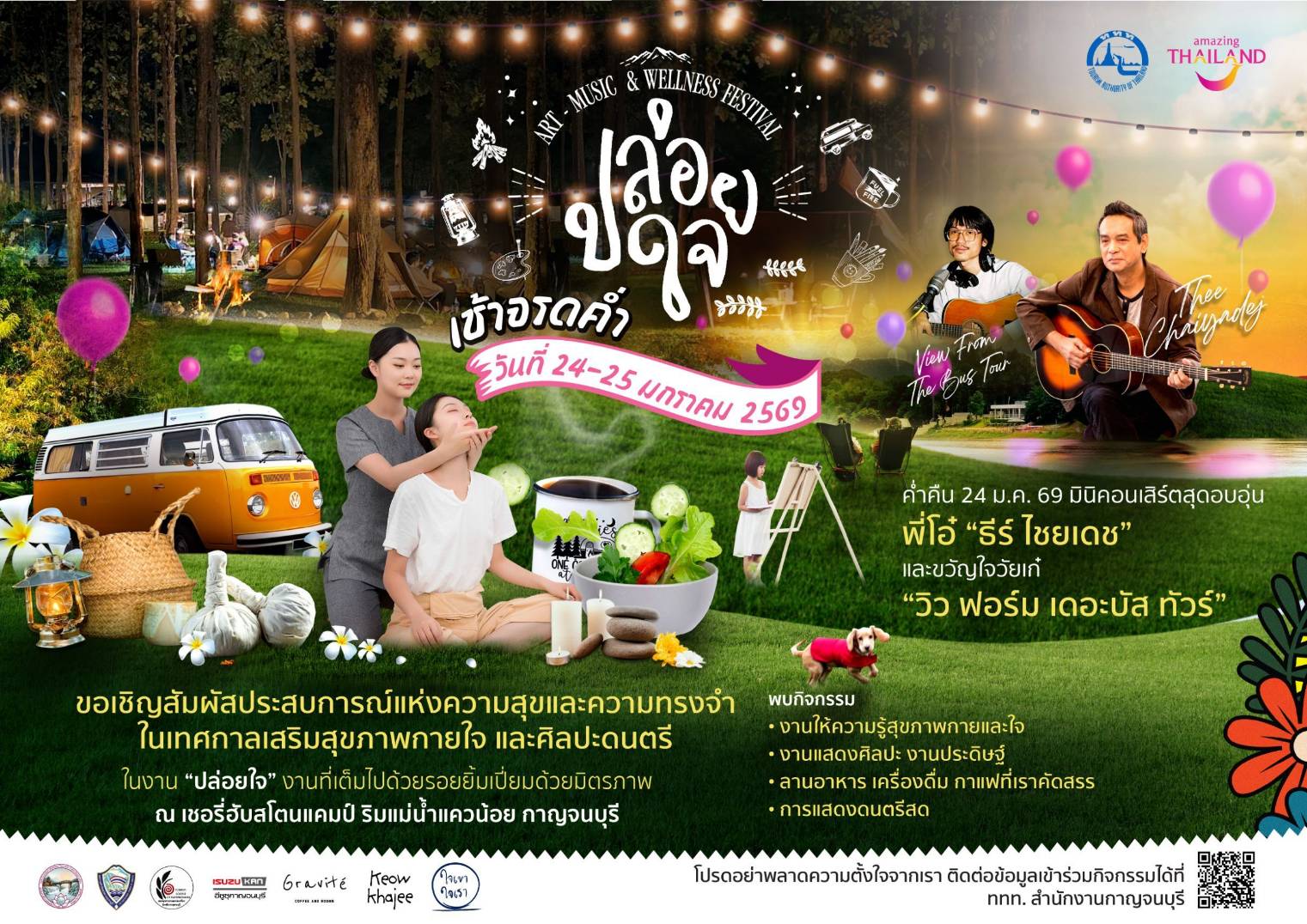 กาญจนบุรี – อีก 3 วัน เชิญเที่ยวปล่อยตัวปล่อยใจไปกับเรา “ปล่อยใจ” Art – Music & Wellness Festival เทศกาลที่รวบรวมงานศิลปะ ดนตรี และการดูแลสุขภาพ มารวมไว้ในที่เดียว เพื่อให้คุณได้ปรนนิบัติทั้งกายและใจไปพร้อมกัน