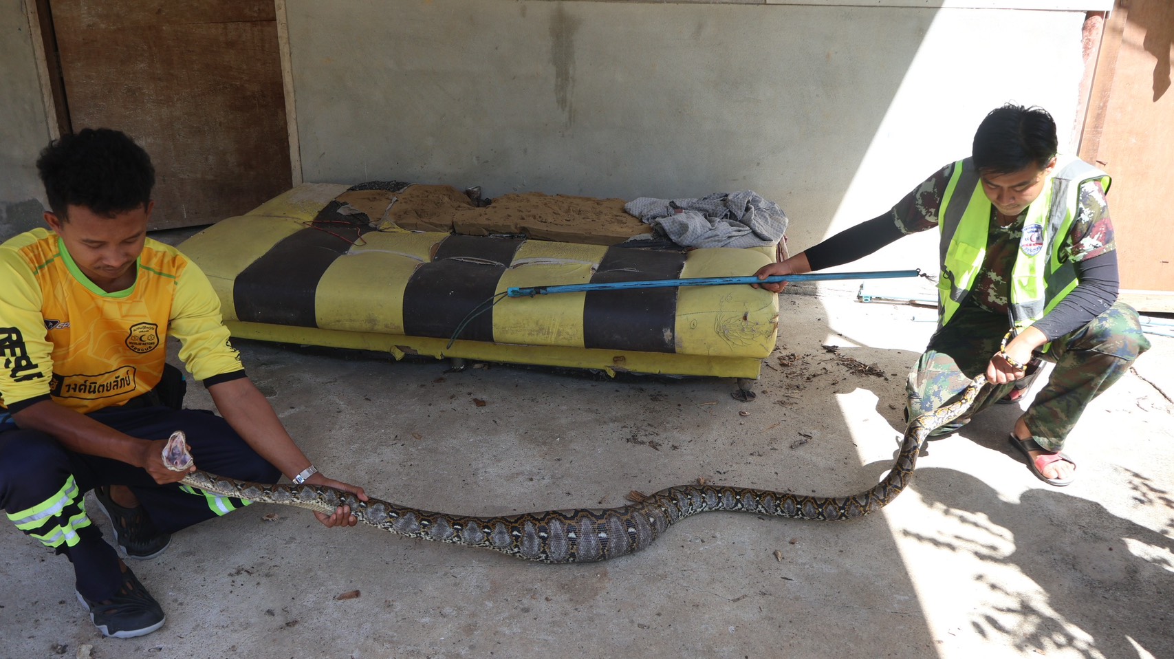 นายแวมะ แวและ อายุ 56 ปี เจ้าของไก่ดำ เล่าว่า ได้ซื้อไก่ดำมา 6 ตัว มีตัวผู้ 1 ตัว ตัวเมีย 5 ตัว และจะนำไปเลี้ยงในสวน แต่ได้นำมาเลี้ยงไว้ที่เล้านี้ก่อน ก่อนหน้านี้ไก่ดำตัวเมียก็หายไป 2 ตัวแล้ว ซึ่งก็คาดว่าโดนงูเหลือมตัวนี้กินไป วันนี้ขณะที่ตนกำลังจะนำอาหารไปให้ไก่กิน พอเปิดประตูเดินเข้าไปก็เห็น งูนอนอยู่ในรังแม่ไก่ที่กำลังฟักไข่ จึงได้โทรศัพท์แจ้งกู้ภัยให้มาช่วยจับงู