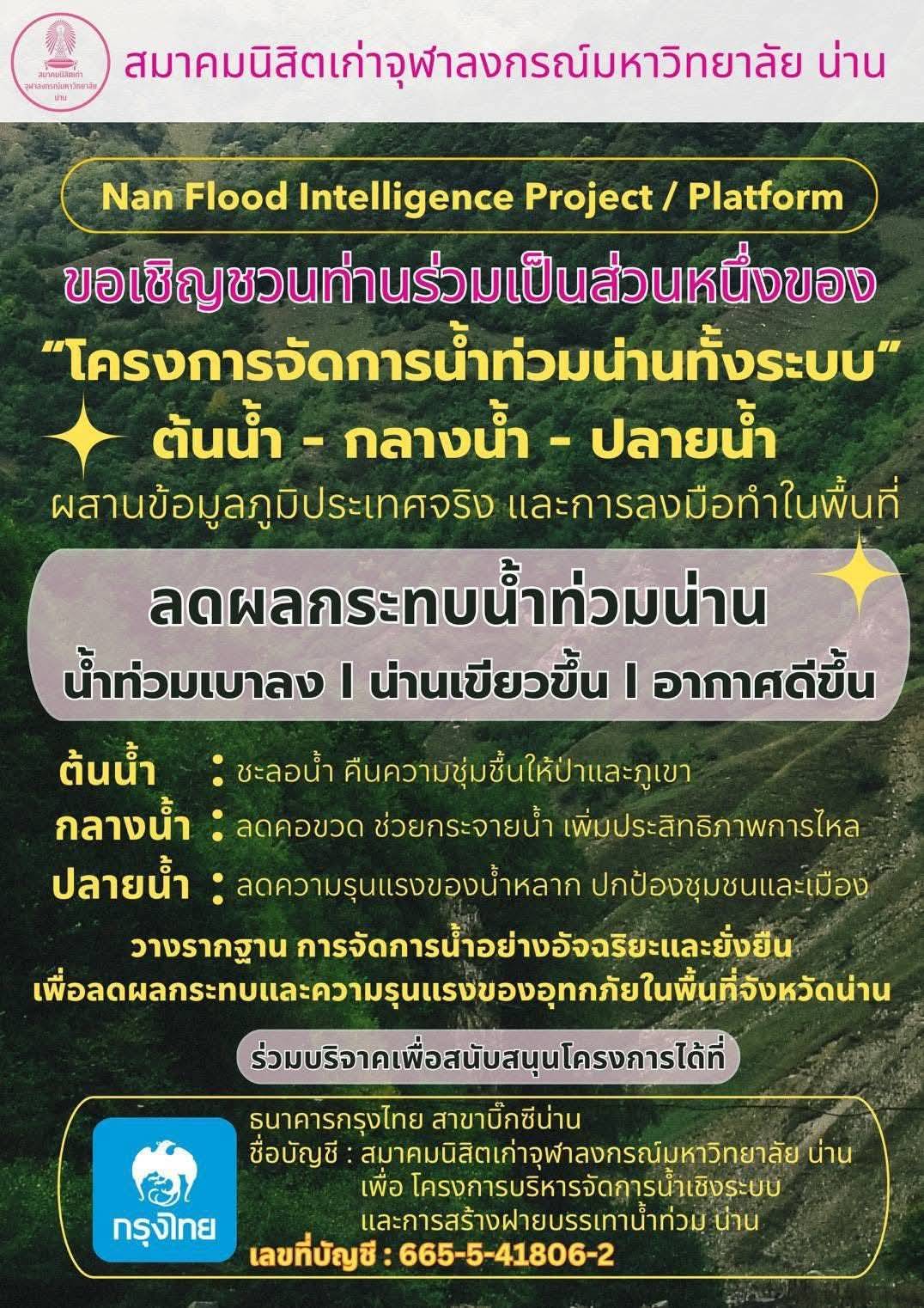 ด้วยการร่วมบริจาคสนับสนุนโครงการ ธนาคารกรุงไทย สาขาบิ๊กซีน่าน เลขที่บัญชี 665-5-41806-2 ชื่อบัญชี: สมาคมนิสิตเก่าจุฬาลงกรณ์มหาวิทยาลัย น่าน (เพื่อโครงการบริหารจัดการน้ำเชิงระบบ และการสร้างฝายบรรเทาน้ำท่วม จังหวัดน่าน) ทุกการบริจาค คือการลงทุนเพื่อความปลอดภัยของเมืองน่าน เพื่ออนาคตที่ยั่งยืนของลุ่มน้ำน่าน เพื่อคนรุ่นนี้ และคนรุ่นต่อไป คนน่านไม่ทิ้งกัน…น่านจะอยู่ได้ ต้องช่วยกันทั้งระบบ