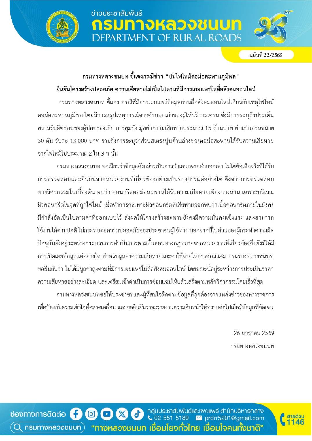 กรมทางหลวงชนบท ชี้แจง กรณีที่มีการเผยแพร่ข้อมูลผ่านสื่อสังคมออนไลน์เกี่ยวกับเหตุไฟไหม้ ตอม่อสะพานภูมิพล โดยมีการสรุปเหตุการณ์จากคำบอกเล่าของผู้ให้บริการเครน ซึ่งมีการระบุถึงประเด็น