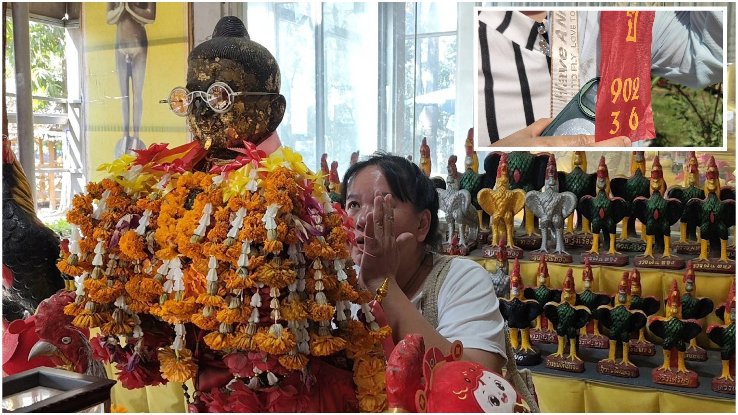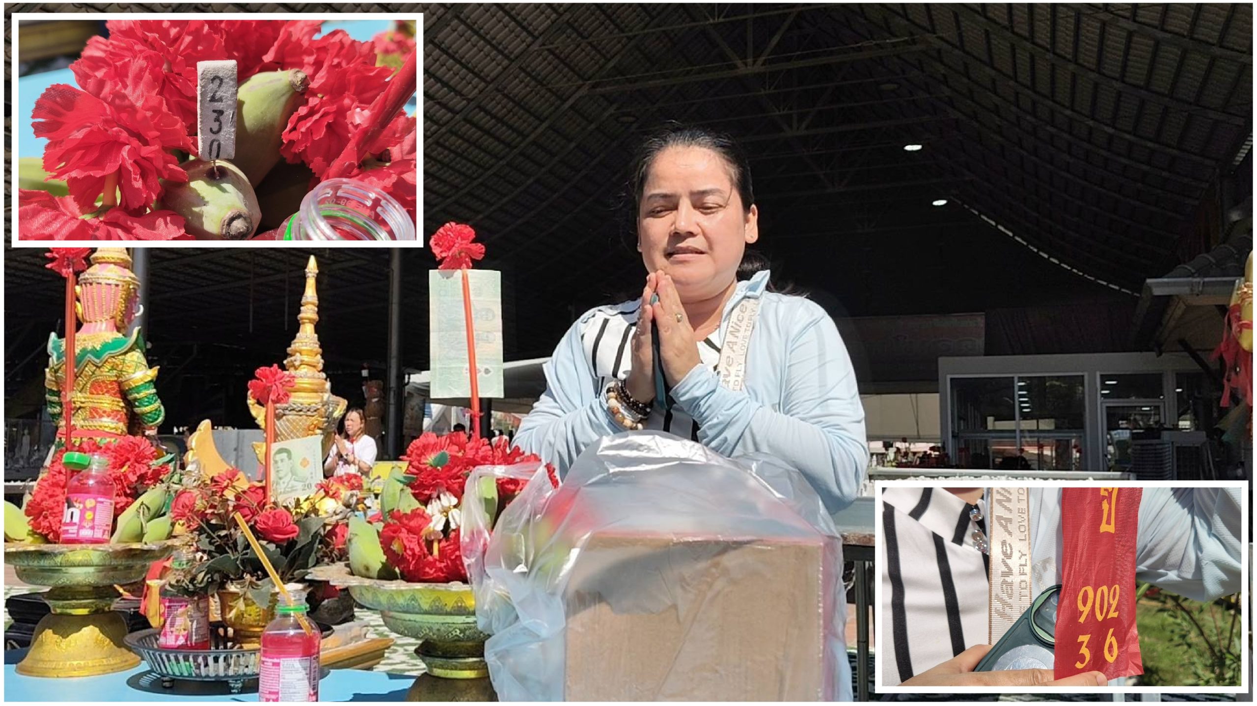 และทางด้านนางสาวอุ้ม (ชื่อเล่น) นำเครื่องเซ่นไหว้ชุดใหญ่พร้อมประทัด 5,000 นัด มาแก้บนท้าวเวสสุวรรณ หลังรับโชคในงวดที่ผ่านมา โดยนางสาวอุ้มกล่าวว่าการเดินทางมาในวันนี้ตั้งใจมาแก้บนท้าวเวสสุวรรณ หลังจากตนเองได้รับโชคลาภและถูกรางวัลติดต่อกันถึง 3 ครั้งแล้ว ถือเป็นความสำเร็จอย่างมาก โดยในครั้งนี้ได้เตรียมประทัดจำนวน 5,000 นัด มาจุดถวายเพื่อเป็นการแก้บนตามที่ได้บอกกล่าวไว้กับท้าวเวสสุวรรณ นางสาวอุ้มยังกล่าวอีกว่า สิ่งที่ขอพรไม่ได้มีเพียงเรื่องโชคลาภเท่านั้น แต่ยังรวมถึงเรื่องหน้าที่การงานและการซื้อขายอสังหาริมทรัพย์ ซึ่งล่าสุดสามารถขายทั้งบ้านและที่ดินได้สำเร็จตามเป้าหมาย จึงนับเป็นอีกหนึ่งความสำเร็จที่ทำให้ต้องเดินทางมาทำพิธีแก้บนในครั้งนี้ พร้อมกล่าวทิ้งท้ายว่า แม้โชคลาภที่ได้รับในแต่ละครั้งอาจไม่ได้เป็นจำนวนมาก แต่ทุกครั้งที่มาขอพรมักจะได้รับโชคกลับไปเสมอ มองว่าเป็นเรื่องของความเคารพและศรัทธาที่มีต่อท้าวเวสสุวรรณ อย่างไรก็ตาม ย้ำว่าเรื่องดังกล่าวเป็นความเชื่อส่วนบุคคลที่ตนเองประสบพบเจอมา จึงอยากให้ทุกคนใช้วิจารณญาณด้วย พร้อมอวยพรให้ทุกคนมีความสุขและร่ำรวยเฮง ๆ ไปด้วยกัน โดยก่อนกลับได้จุดประทัดได้เลข 902 และ 36 และจากจุดธูปได้เลข 230 นำกลับไปลุ้นโชคงวดต่อไป