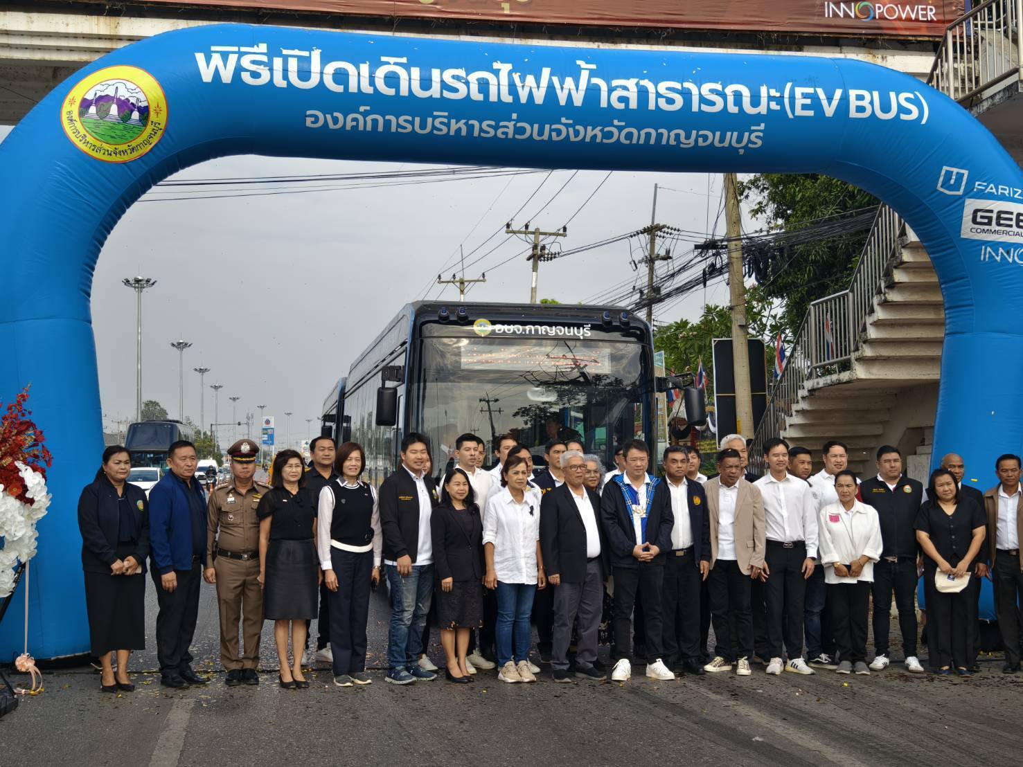 สำหรับรถโดยสารไฟฟ้าสาธารณะ (EV Bus) สายแรกของกาญจนบุรี ให้บริการโดย อบจ.กาญจนบุรี เริ่มทดลองวิ่งให้บริการฟรี ตั้งแต่วันที่ 25 มกราคม 2569 โดยใช้รถเมล์ไฟฟ้าปรับอากาศ EV ชานต่ำสีฟ้า ยี่ห้อ GEELY Farizon Auto รุ่น C10E จำนวน 12 คัน ขนาด 30 ที่นั่ง ให้บริการเดินรถตั้งแต่เวลา 06.00 – 19.00 น. ความถี่ 15-30 นาทีต่อคัน เส้นทางครอบคลุมทั้งโรงเรียน หน่วยงานราชการ โรงพยาบาล และแหล่งธุรกิจ ดังนี้