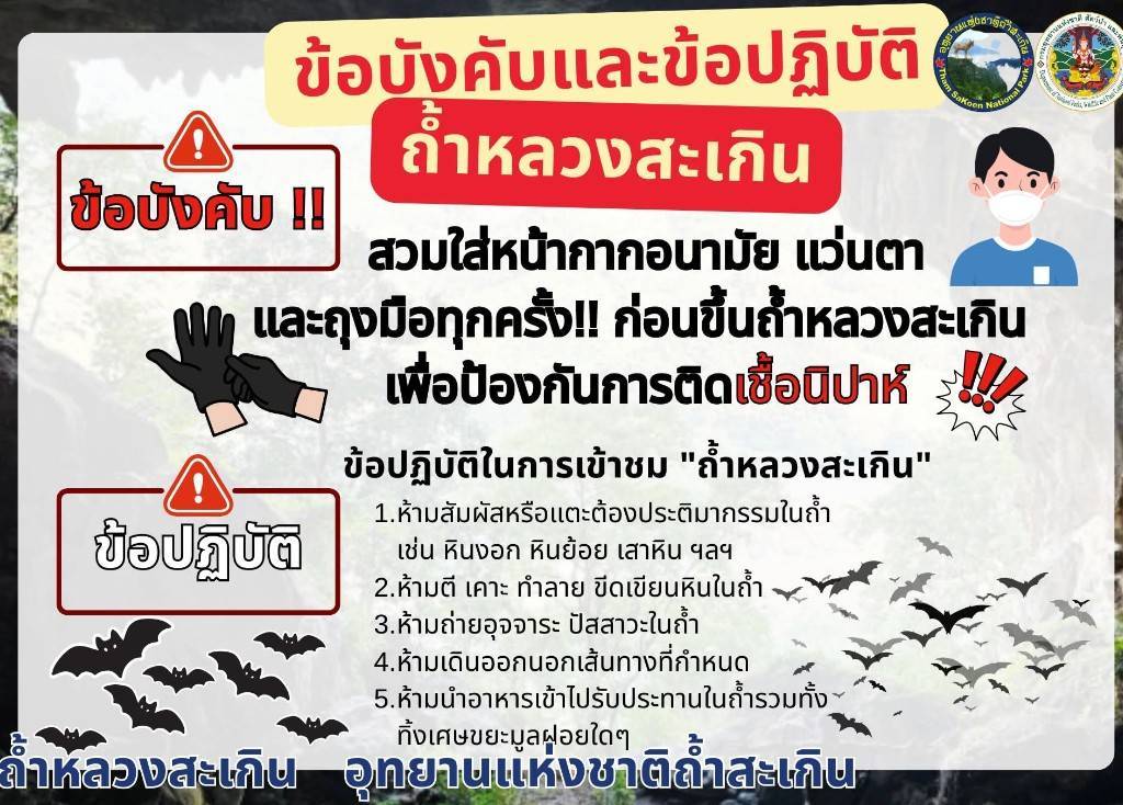 นายสุรชัย สิงห์เหาะ หัวหน้าอุทยานแห่งชาติถ้ำสะเกิน สำนักบริหารพื้นที่อนุรักษ์ที่ 13 (แพร่) ขอความร่วมมือนักท่องเที่ยวที่ประสงค์เข้าชมแหล่งท่องเที่ยว ถ้ำหลวงสะเกิน เนื่องจากเป็นพื้นที่ที่มีค้างคาวอาศัยอยู่เป็นจำนวนมาก ซึ่งอยู่ในช่วง เฝ้าระวังความเสี่ยงจากเชื้อไวรัสนิปาห์ (Nipah virus : NiV) ซึ่งเป็นโรคติดต่อจากสัตว์สู่คน และอาจติดต่อผ่านการสัมผัสสัตว์ป่า หรือสารคัดหลั่งของสัตว์ เช่น น้ำลาย เลือด หรือมูล รวมถึงอาหารและเครื่องดื่มที่อาจปนเปื้อน