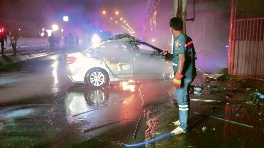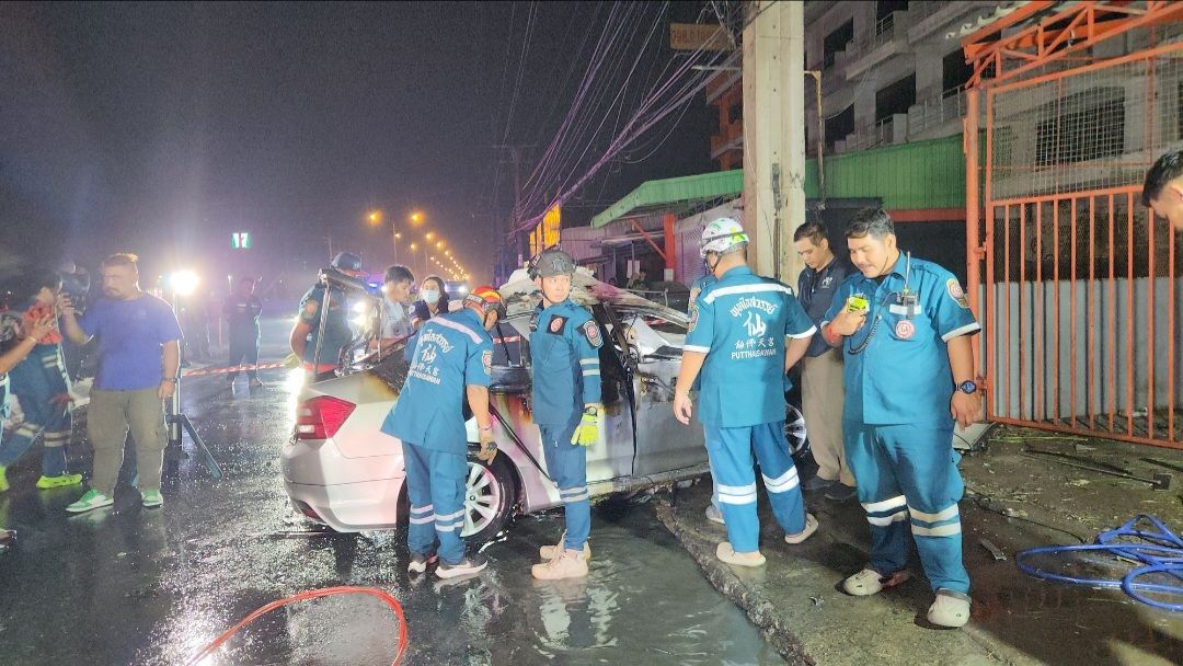 จากการตรวจสอบกล้องวงจรปิดบริเวณอาคารพบภาพรถยนต์เก๋งขับมาด้วยความเร็ว ก่อนพุ่งชนเสาไฟฟ้าริมถนนอย่างแรง จนเครื่องยนต์กระเด็นเข้าไปในอาคารและเกิดประกายไฟ เจ้าของอาคารรีบออกมาดับไฟและพยายามช่วยเหลือผู้ขับขี่ทันที แต่ไม่สำเร็จ เนื่องจากไฟลุกไหม้อย่างรวดเร็ว