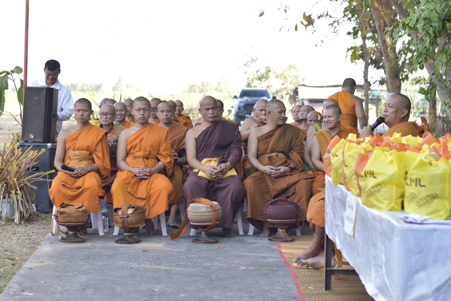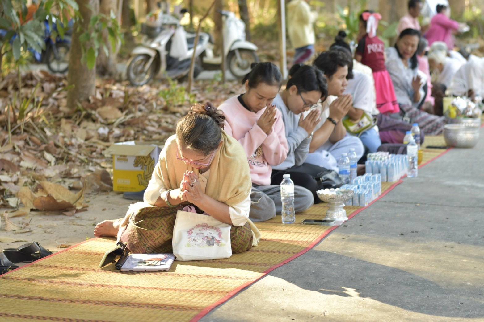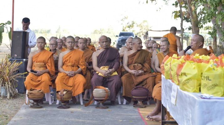 พุทธศาสนิกชนชาวมหาสารคามและจังหวัดใกล้เคียง ร่วมทำบุญตักบาตรพระสงฆ์แบบโบราณด้วยการนั่งเสื่อ ตามความศรัทธา คณะสงฆ์กว่า 35 รูป