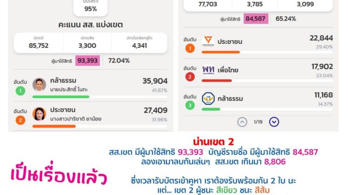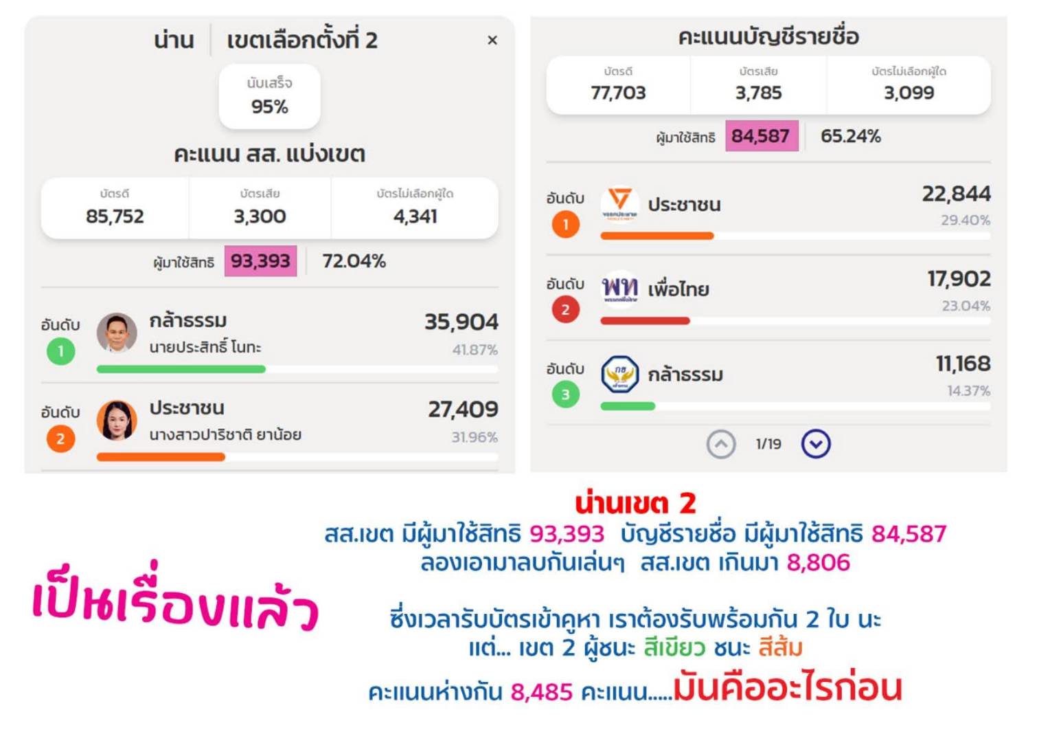 น่าน – การเลือกตั้งสมาชิกสภาผู้แทนราษฎร เขต 2 จังหวัดน่าน กำลังถูกจับตามองอย่างใกล้ชิด หลังปรากฏตัวเลขผู้มาใช้สิทธิ์เลือกตั้งที่ไม่สอดคล้องกันระหว่างบัตรเลือกตั้งสองประเภท จนถูกตั้งข้อสังเกตว่าอาจเข้าข่ายกรณี “บัตรเขย่ง” ข้อมูลอย่างเป็นทางการระบุว่า ผู้มาใช้สิทธิ์เลือกตั้ง สส.แบบแบ่งเขต (บัตรสีเขียว) มีจำนวน 93,393 คน ขณะที่ผู้มาใช้สิทธิ์เลือกตั้ง สส.แบบบัญชีรายชื่อ (บัตรสีชมพู) มีเพียง 84,587 คน ส่งผลให้เกิดความแตกต่างของจำนวนผู้ใช้สิทธิ์สูงถึง 8,806 คน ขณะเดียวกัน ผลคะแนนผู้สมัคร สส.แบบแบ่งเขต พบว่า ผู้สมัครจากพรรคสีเขียว ซึ่งได้อันดับ 1 มีคะแนน 35,904 คะแนน เอาชนะผู้สมัครจากพรรคสีส้ม ซึ่งได้ 27,409 คะแนน มีผลต่างคะแนนแพ้–ชนะอยู่ที่ 8,485 คะแนน ตัวเลขดังกล่าวถูกตั้งข้อสังเกตอย่างหนัก เนื่องจากผลต่างคะแนนแพ้–ชนะมีความใกล้เคียงกับจำนวนผู้ใช้สิทธิ์ที่หายไประหว่างบัตรเลือกตั้งสองใบอย่างผิดสังเกต แหล่งข่าวทางการเมืองในพื้นที่ตั้งคำถามว่า ตามขั้นตอนการเลือกตั้ง ผู้มีสิทธิ์จะต้องได้รับบัตรเลือกตั้งทั้งสองประเภทพร้อมกันก่อนเข้าคูหา แต่ตัวเลขที่ปรากฏกลับสะท้อนว่า ผู้มาใช้สิทธิ์บัตรสีเขียวมีจำนวนมากกว่าบัตรสีชมพูถึงหลายพันคน ประเด็นสำคัญที่ถูกหยิบยกขึ้นมาคือ ผู้มีสิทธิ์ที่ได้รับบัตรเลือกตั้งครบทั้งสองใบมีจำนวนเท่าใดกันแน่ และความคลาดเคลื่อนดังกล่าวเกิดขึ้นจากขั้นตอนใด แม้ขณะนี้ยังไม่มีการชี้ชัดถึงความผิดปกติทางกฎหมาย แต่กรณีดังกล่าวถูกมองว่าเป็นเรื่องที่คณะกรรมการการเลือกตั้งจังหวัดน่าน (กกต.น่าน) จำเป็นต้องออกมาชี้แจงต่อสาธารณะอย่างละเอียด เพื่อคลายข้อกังขา และรักษาความน่าเชื่อถือของกระบวนการเลือกตั้ง ท่ามกลางบรรยากาศการแข่งขันทางการเมืองที่เข้มข้น คำถามสำคัญอาจไม่ใช่เพียงว่า “ใครชนะ” หากแต่คือ การเลือกตั้งครั้งนี้เป็นธรรมและสามารถตรวจสอบได้มากน้อยเพียงใด ###############
